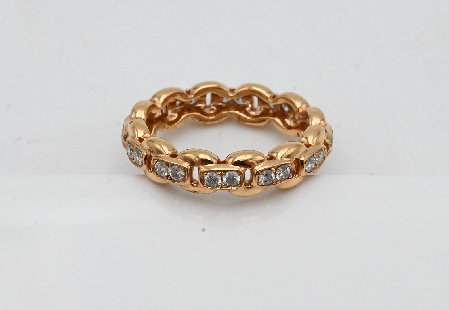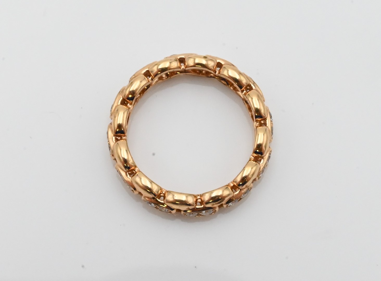 18 Karat Yellow Gold Band, made in links, set with diamond surround, size 6 1/4, 4.8 grams.