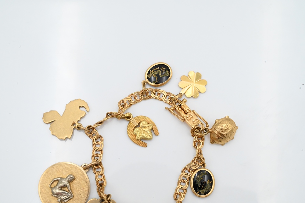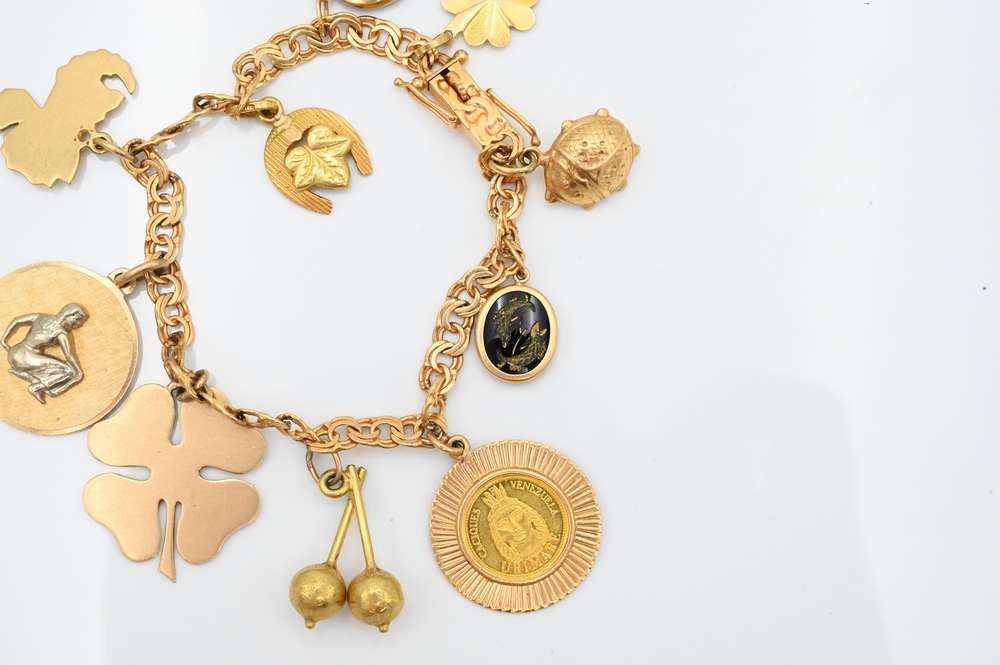 18K G.D. & Co. Bracelet with Charms, set with four 14K gold charms and Venezuelan gold coin, 31.5 grams.