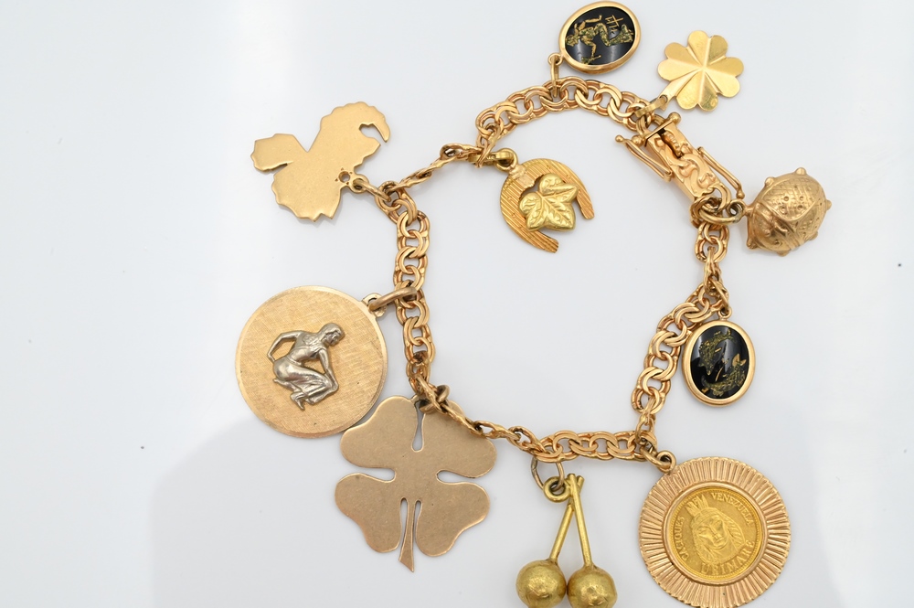 Lot 5: 18K G.D. & Co. Bracelet with Charms, set with four 14K gold charms and Venezuelan gold coin, 31.5 grams.