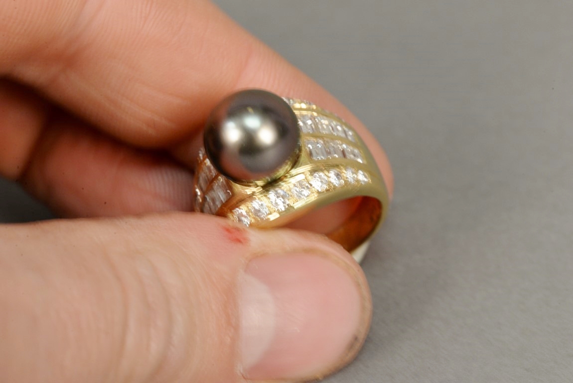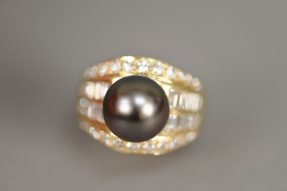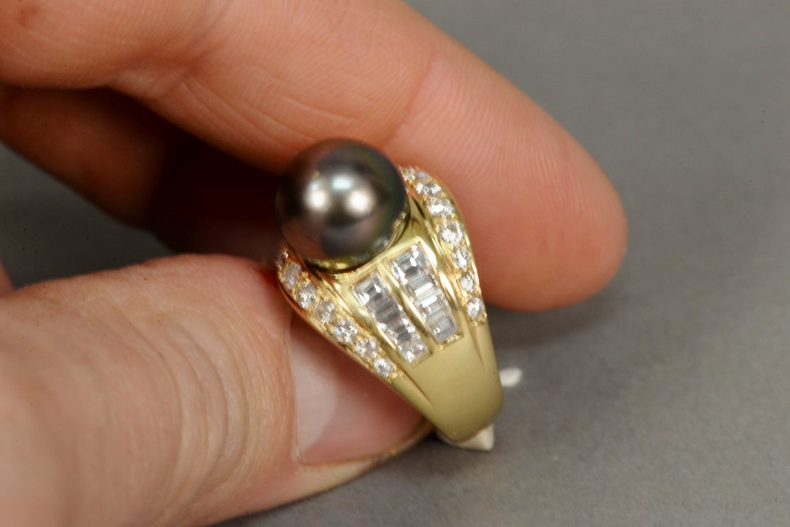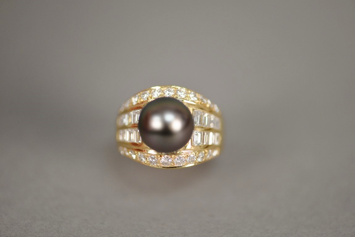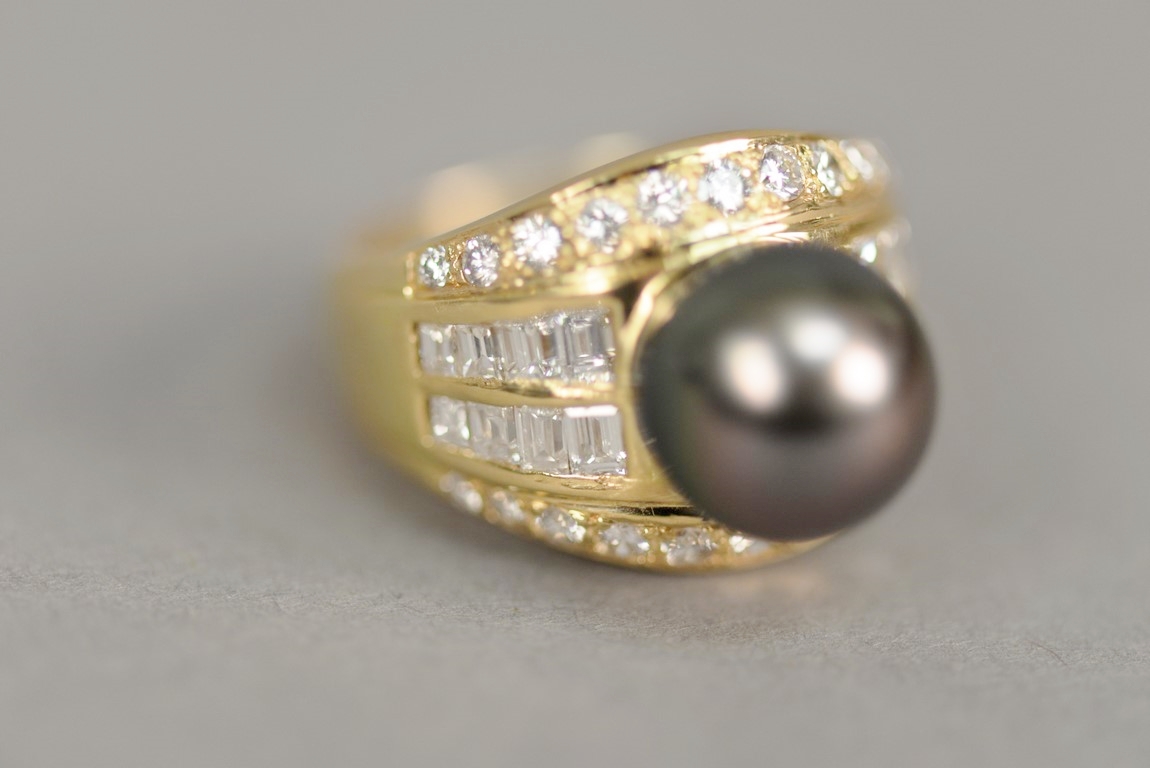 Channel and bead set Tahitian Black South Sea cultured pearl and diamond ring in 18K stamped yellow gold. The ring centers one Tahitian Black South Sea cultured pearl measuring approximately 10mm with two rows of channel set straight baguette cut diamonds on each shoulder each containing four diamonds a total of sixteen straight baguette diamonds and two outer rows containing eleven graduated beads set round brilliant cut diamond melee a total of twenty-two round brilliant cut diamonds. The shank has a brightly polished finish with a temporary ring guard on inside and tapers from 11 to 4.2mm. The ring weighs 12.8 grams, including the stones. Total estimated pave’ diamond weight – 1.40 carats, color G-H, clarity VS. Total estimated baguette cut diamond weight – 0.72 carats, color G-H, clarity SI.