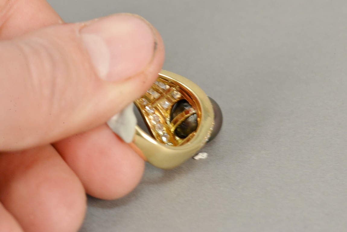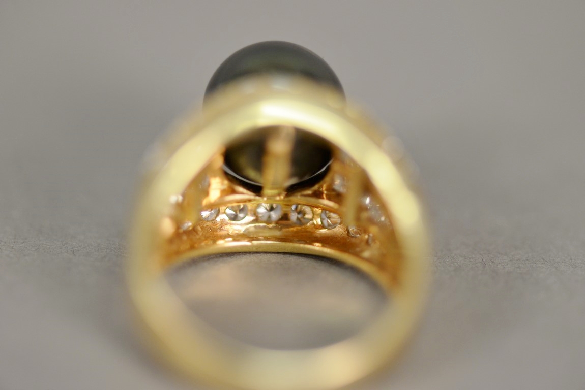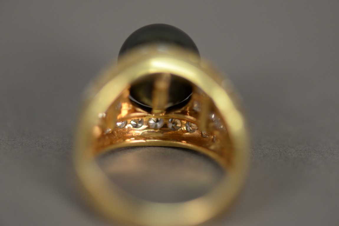 Lot 5: Channel and bead set Tahitian Black South Sea cultured pearl and diamond ring in 18K stamped yellow gold. The ring centers one Tah…