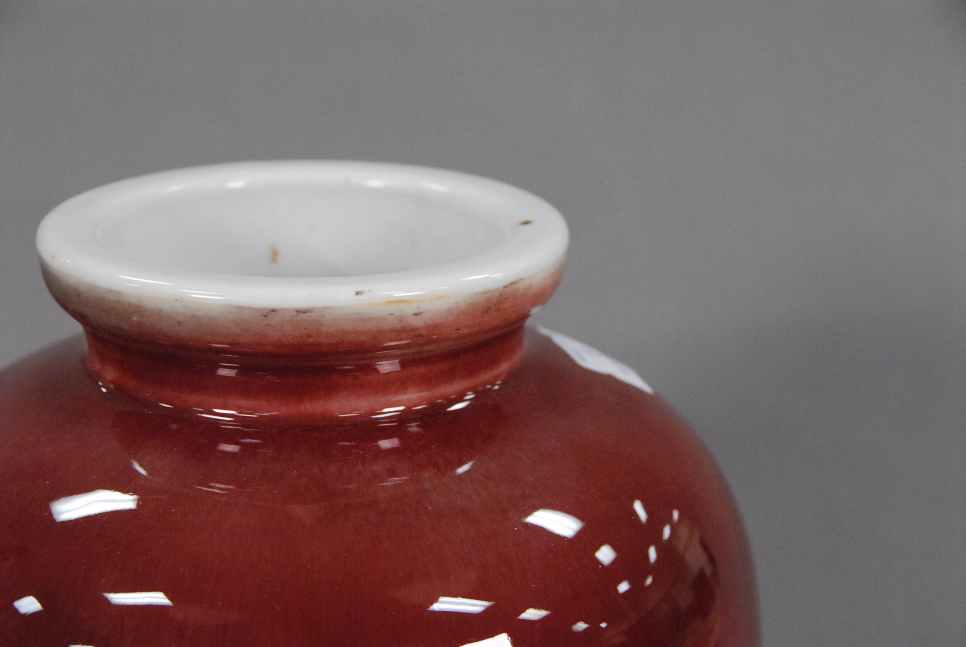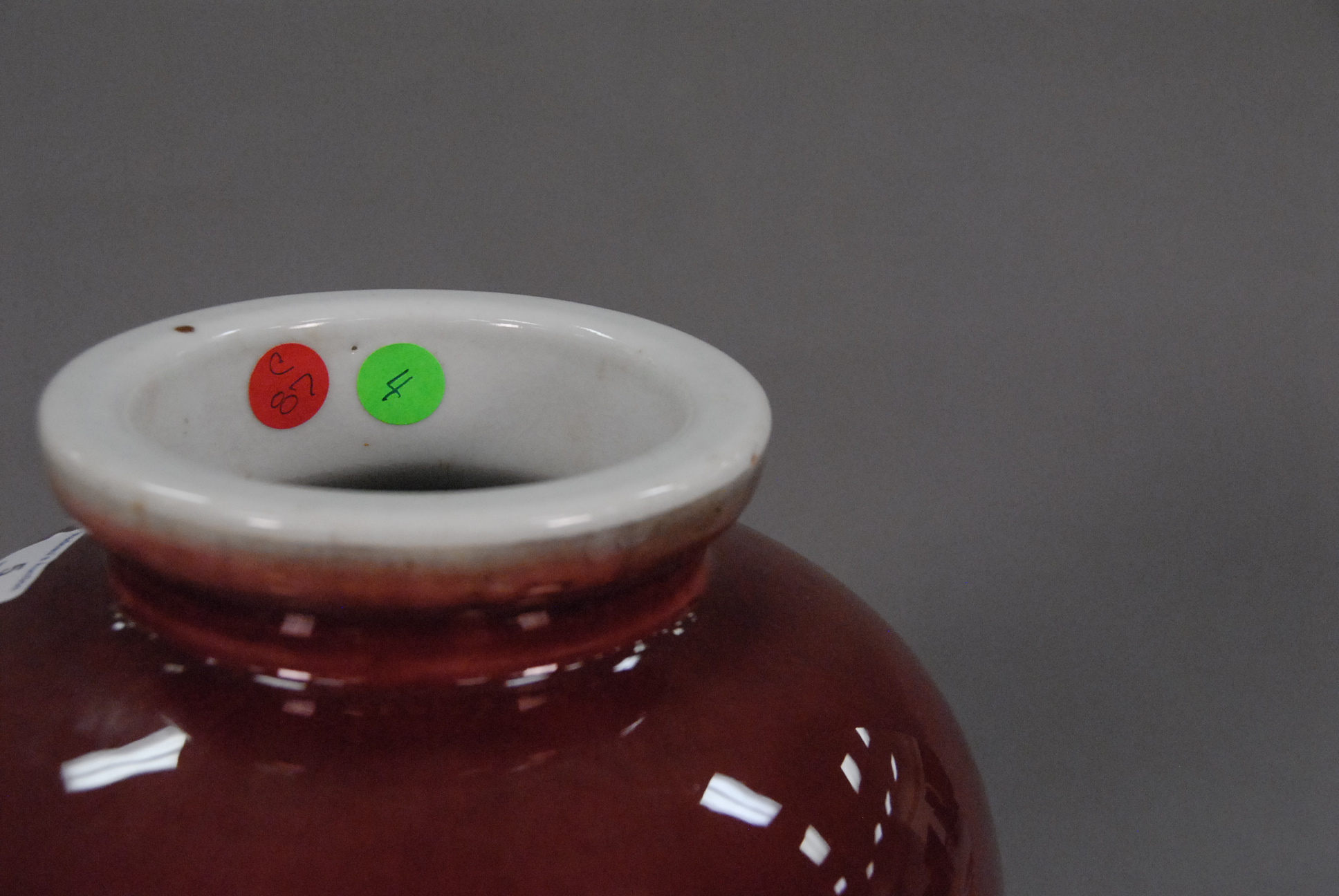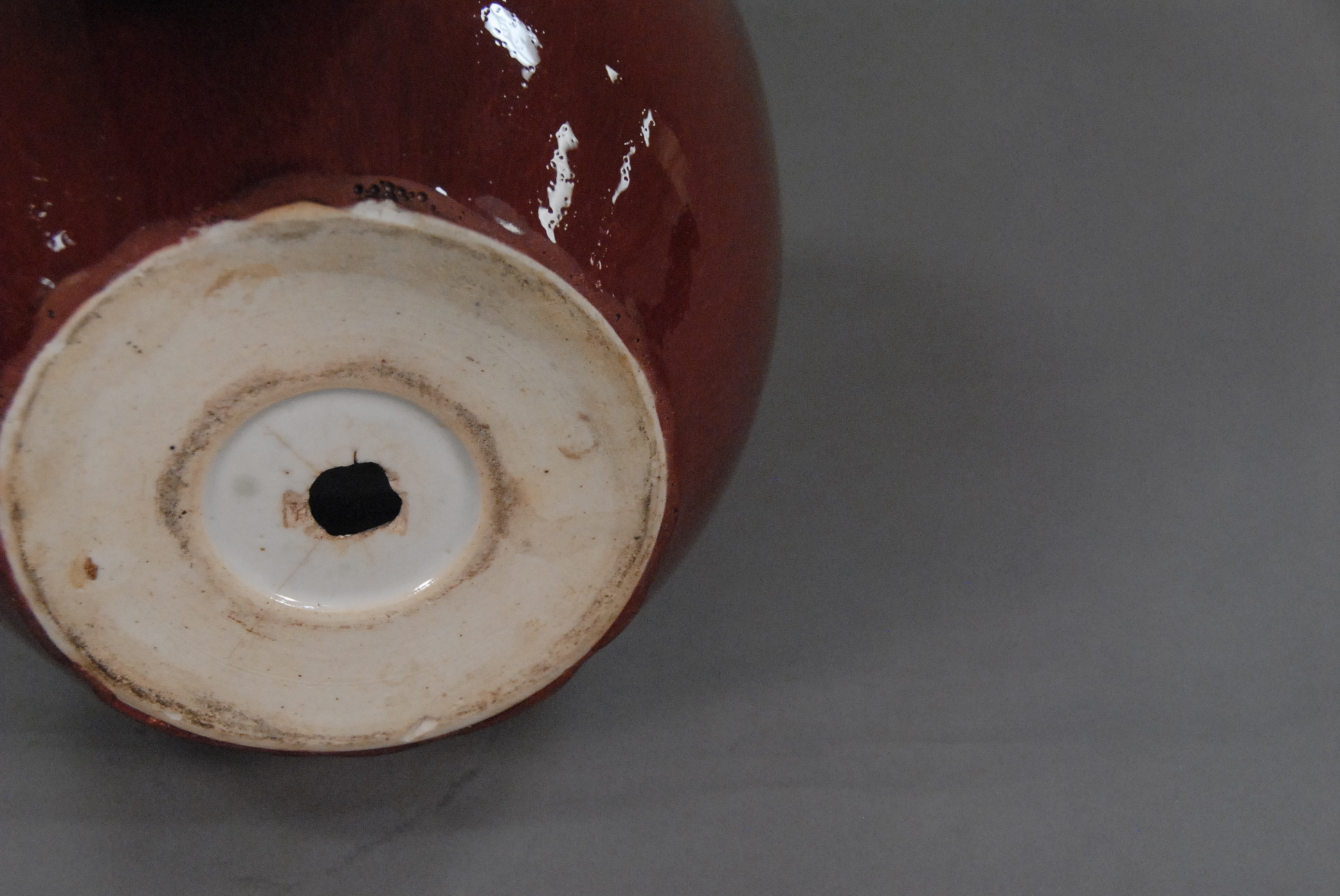 Dark ruby-red glazed jar, round bulbous form with white ring around top drilled at one point to make a lamp.