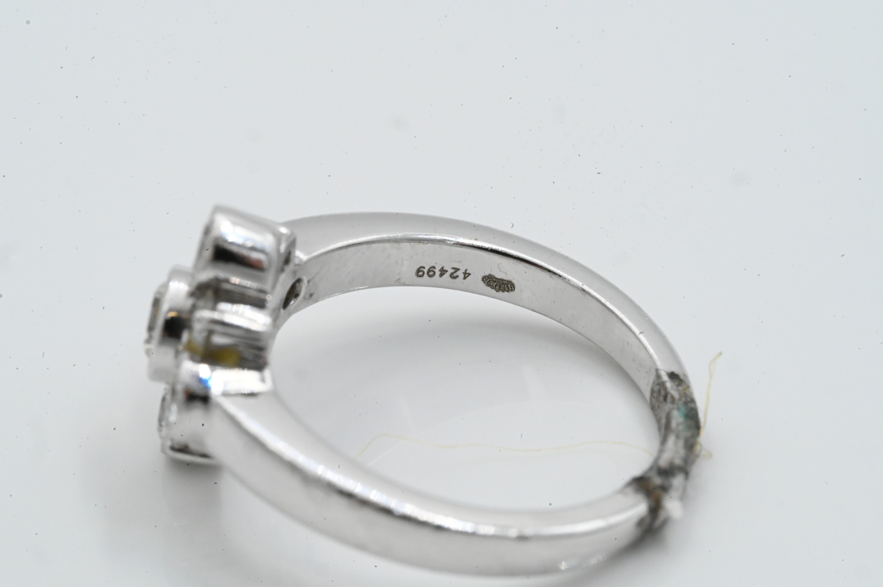 designed as a flower motif with bezel-set round brilliant-cut diamonds, shank interior stamped 18K KWAT, numbered 42799, total weight 5.81 grams.