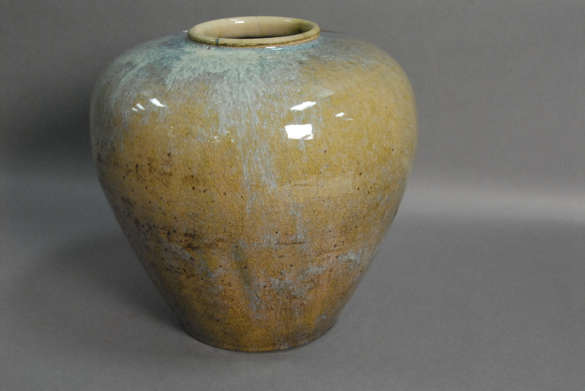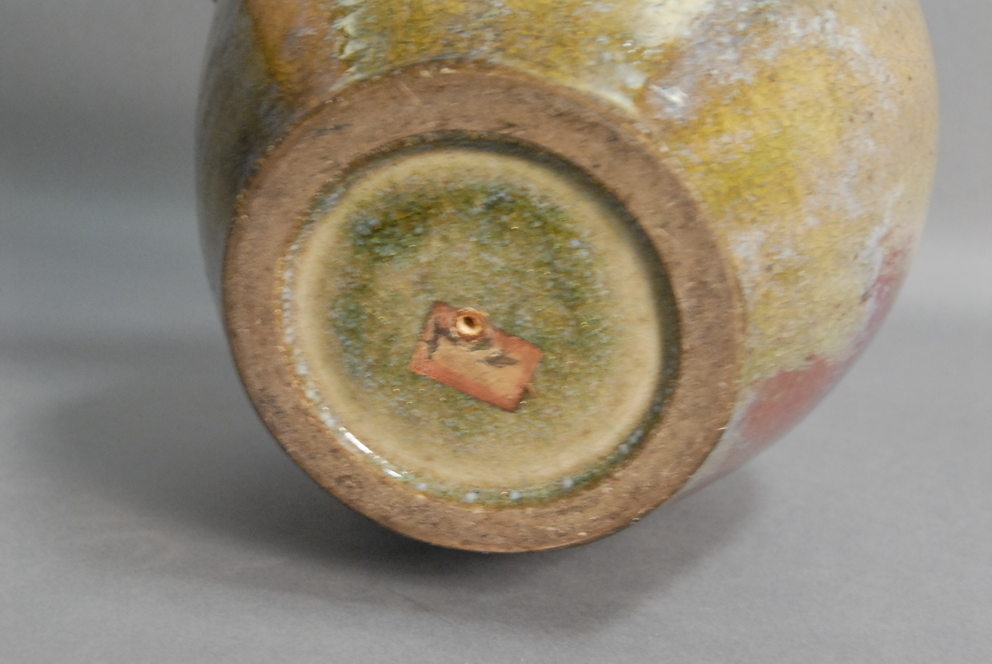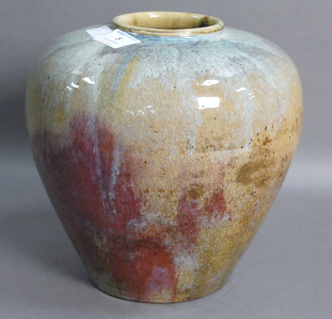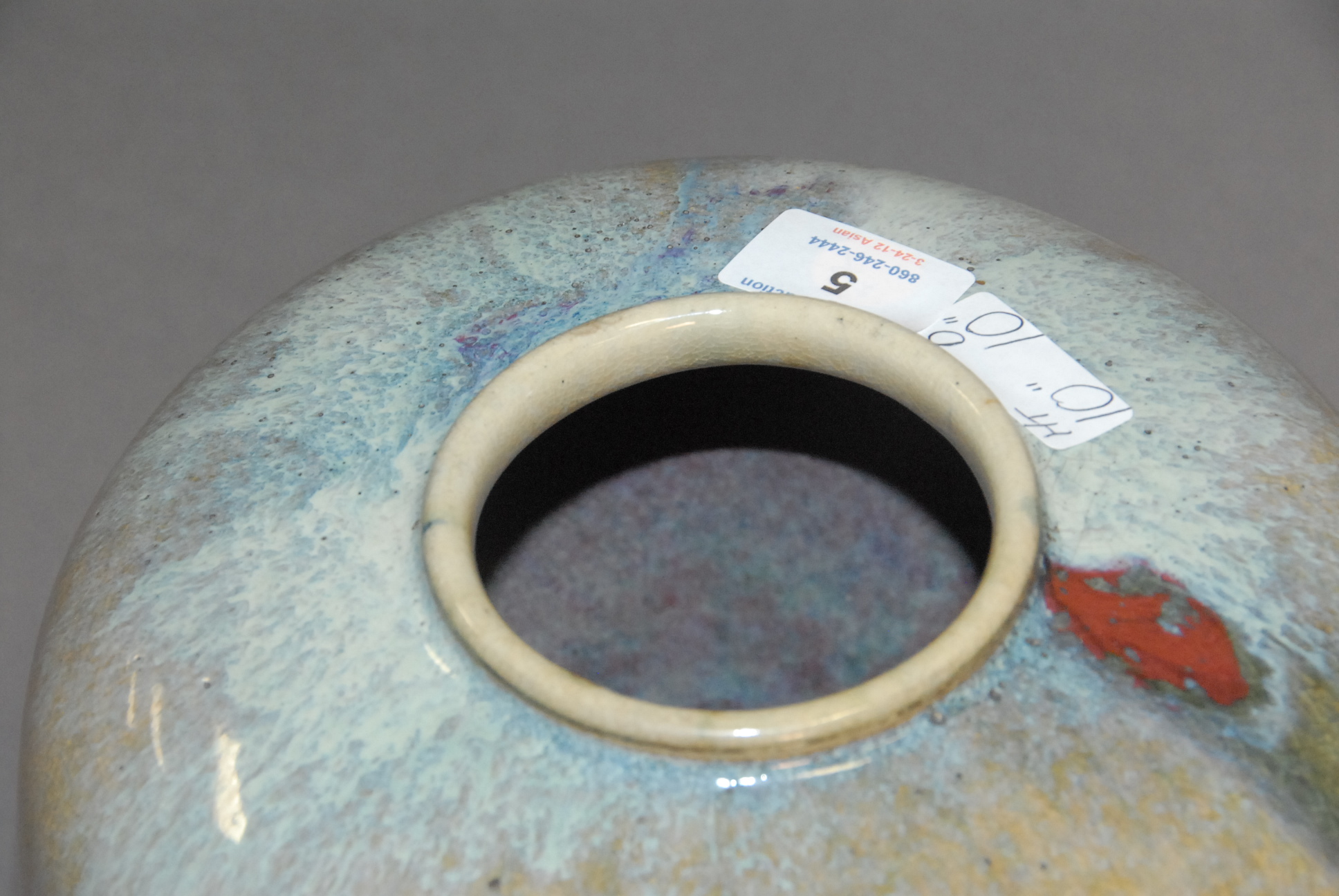 Lot 5: Flamb glazed vase, turquoise, green, and purple infused glaze vase with old paper label on bottom, ht. 10, dia. 10.
