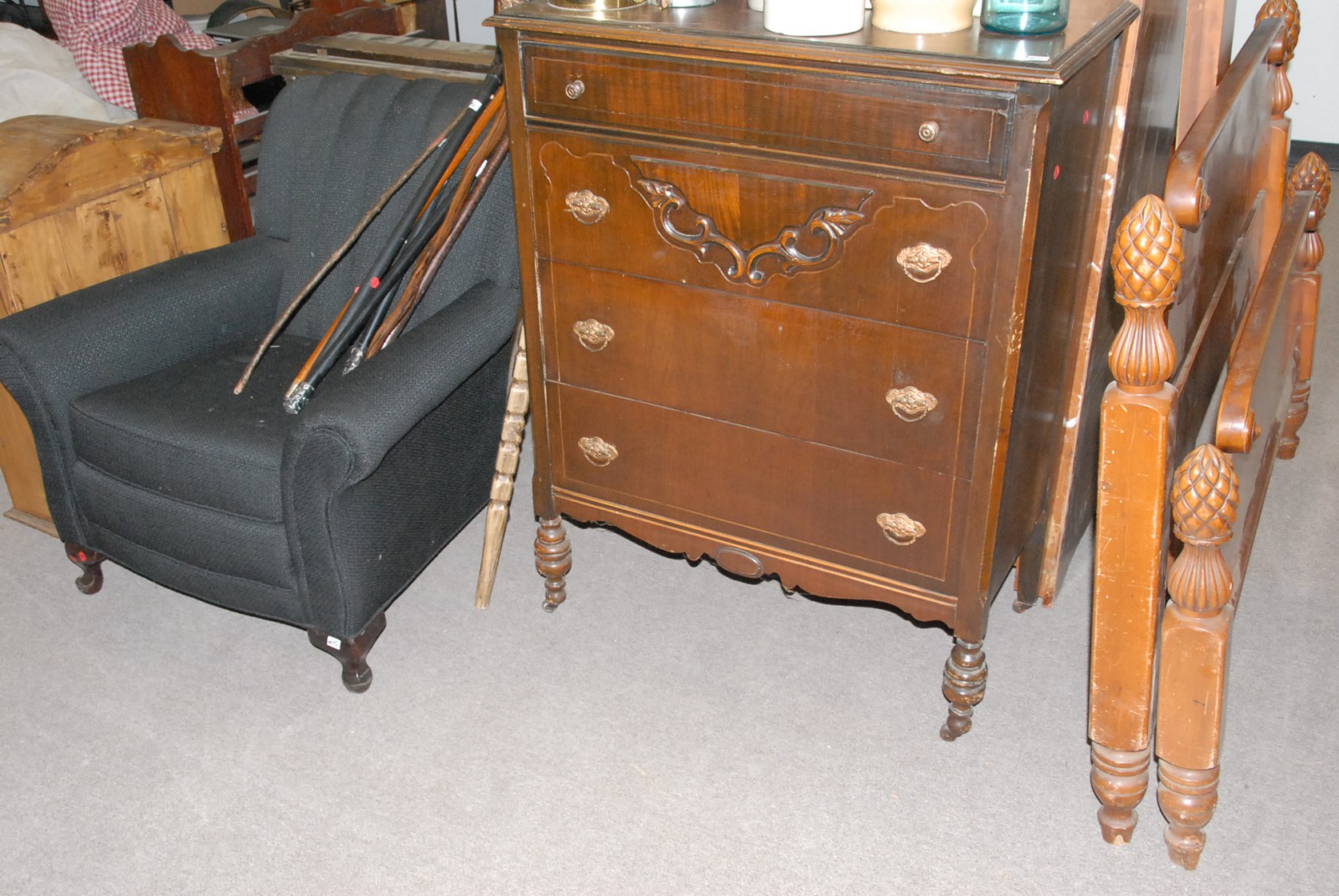 Group lot to include a shelf, cabinet, spinet desk, a chest, a hall table, a maple bed, and a chifferobe cabinet
