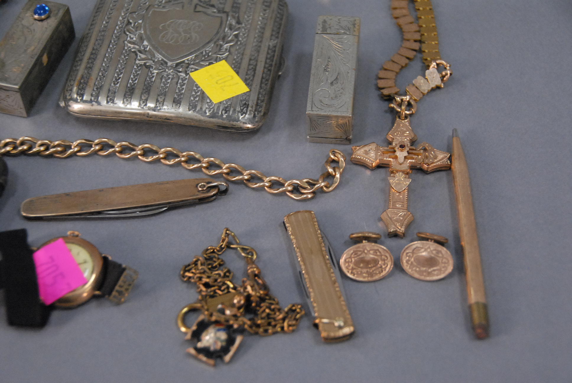 Group lot to include two silver lipstick containers, cigarette holder, match safe, Victorian gold plated items, three watches, and a jackknife.