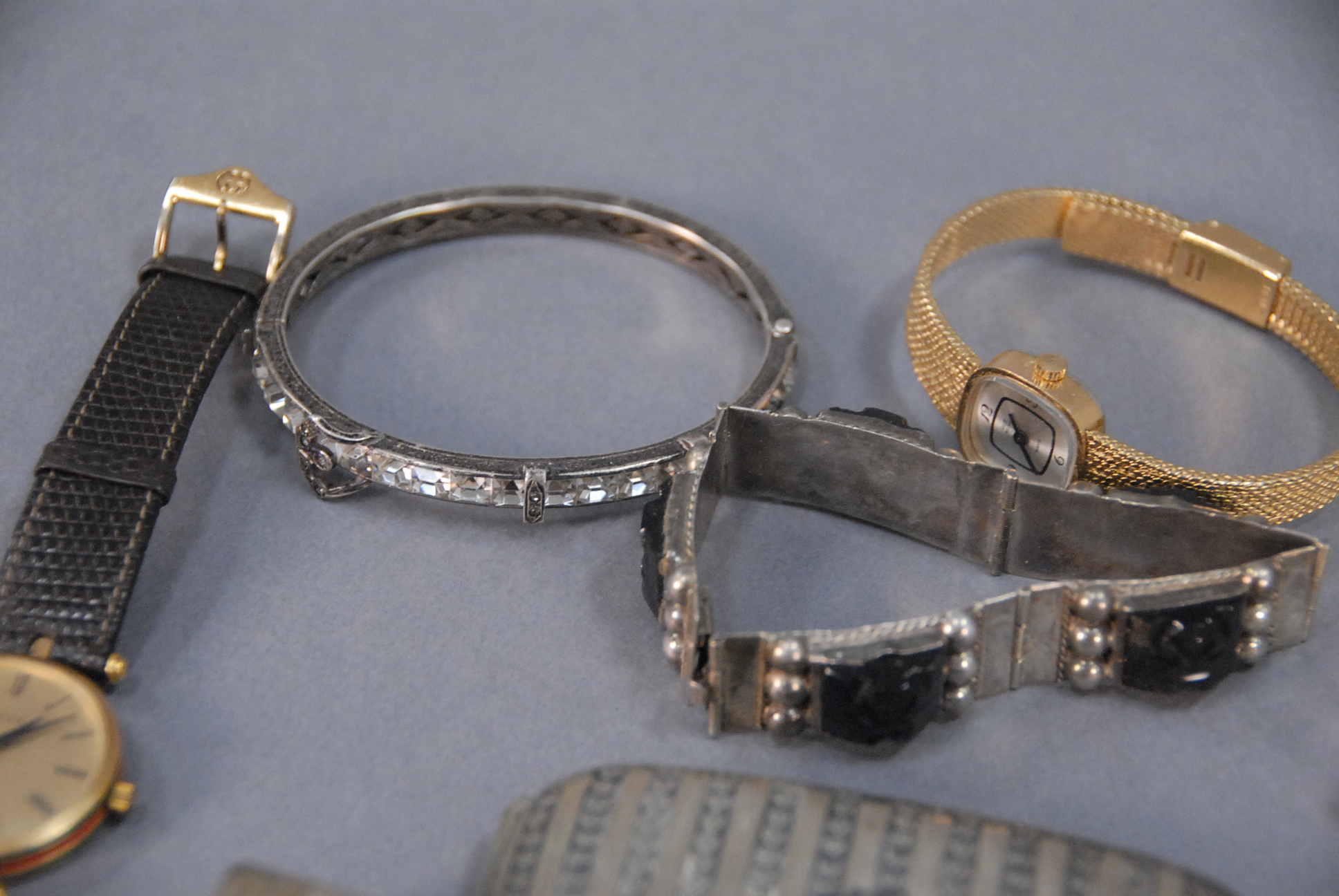 Lot 5: Group lot to include two silver lipstick containers, cigarette holder, match safe, Victorian gold plated items, three watches, and a…