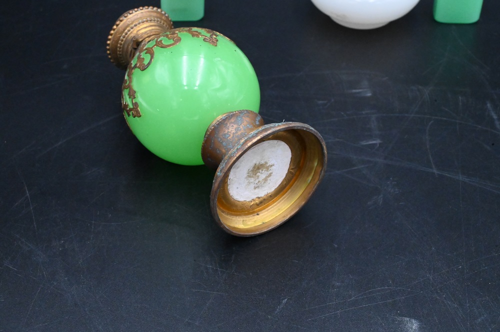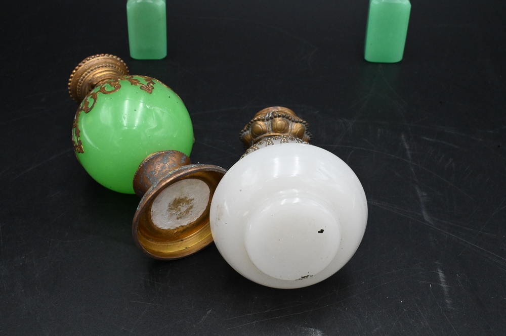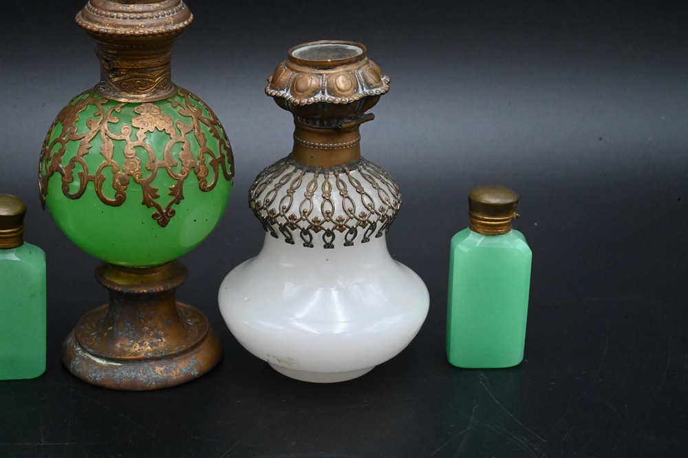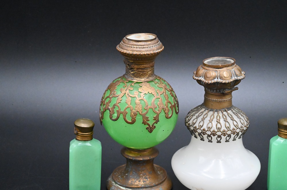 Group of Four Opaline Perfumes, to include green and white with metal overlay.