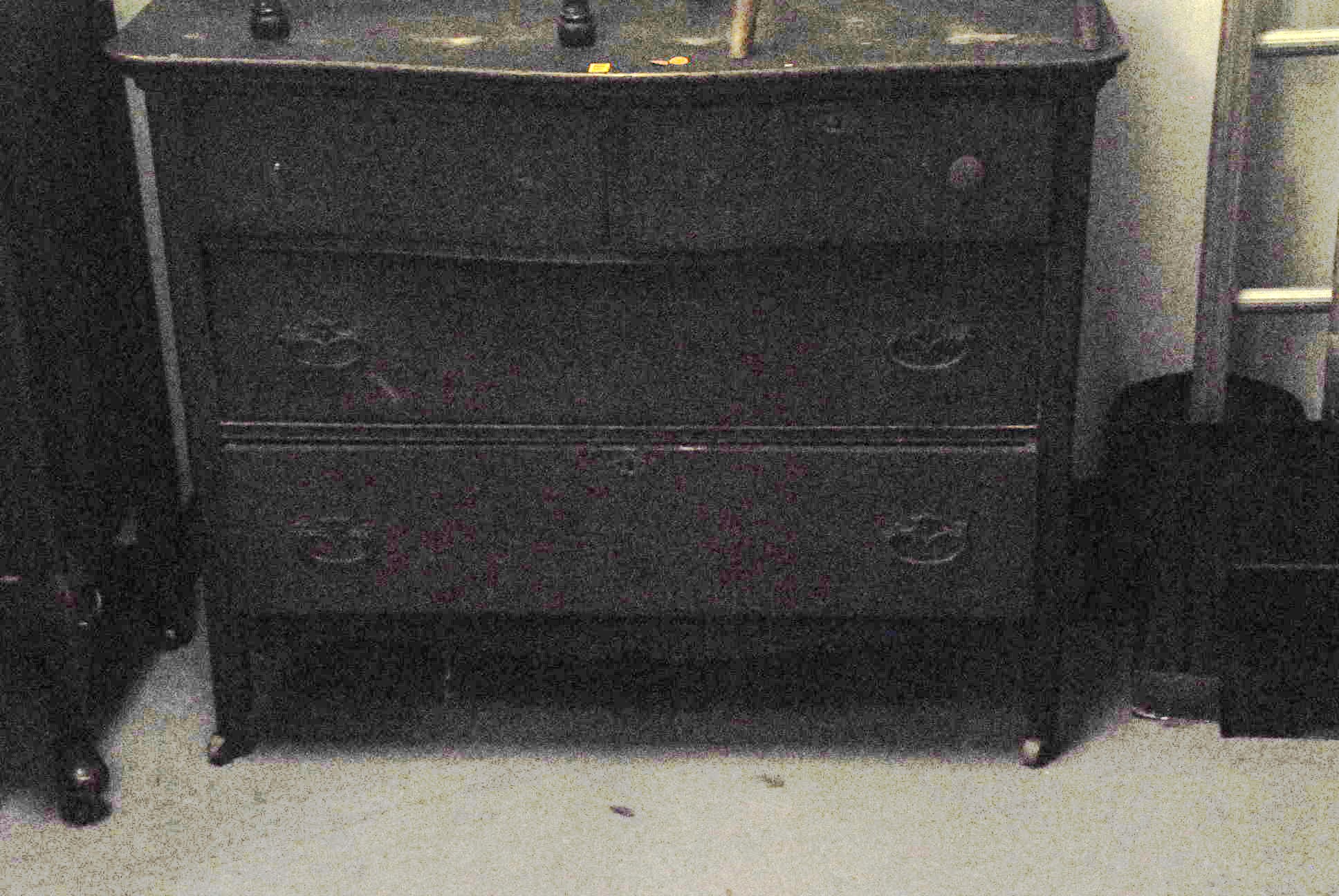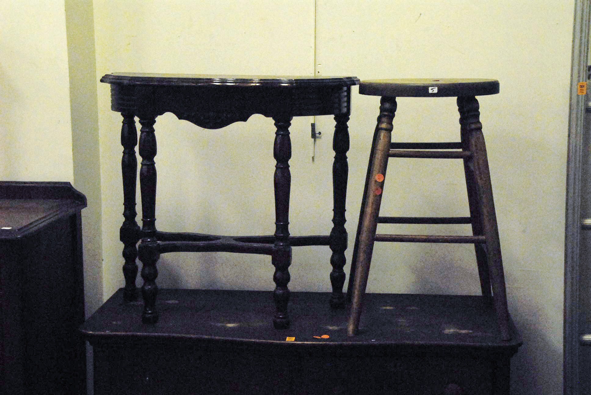 Group of furniture to include a walnut chest, oak chest, pine table, sewing machine, odd table, and a stool