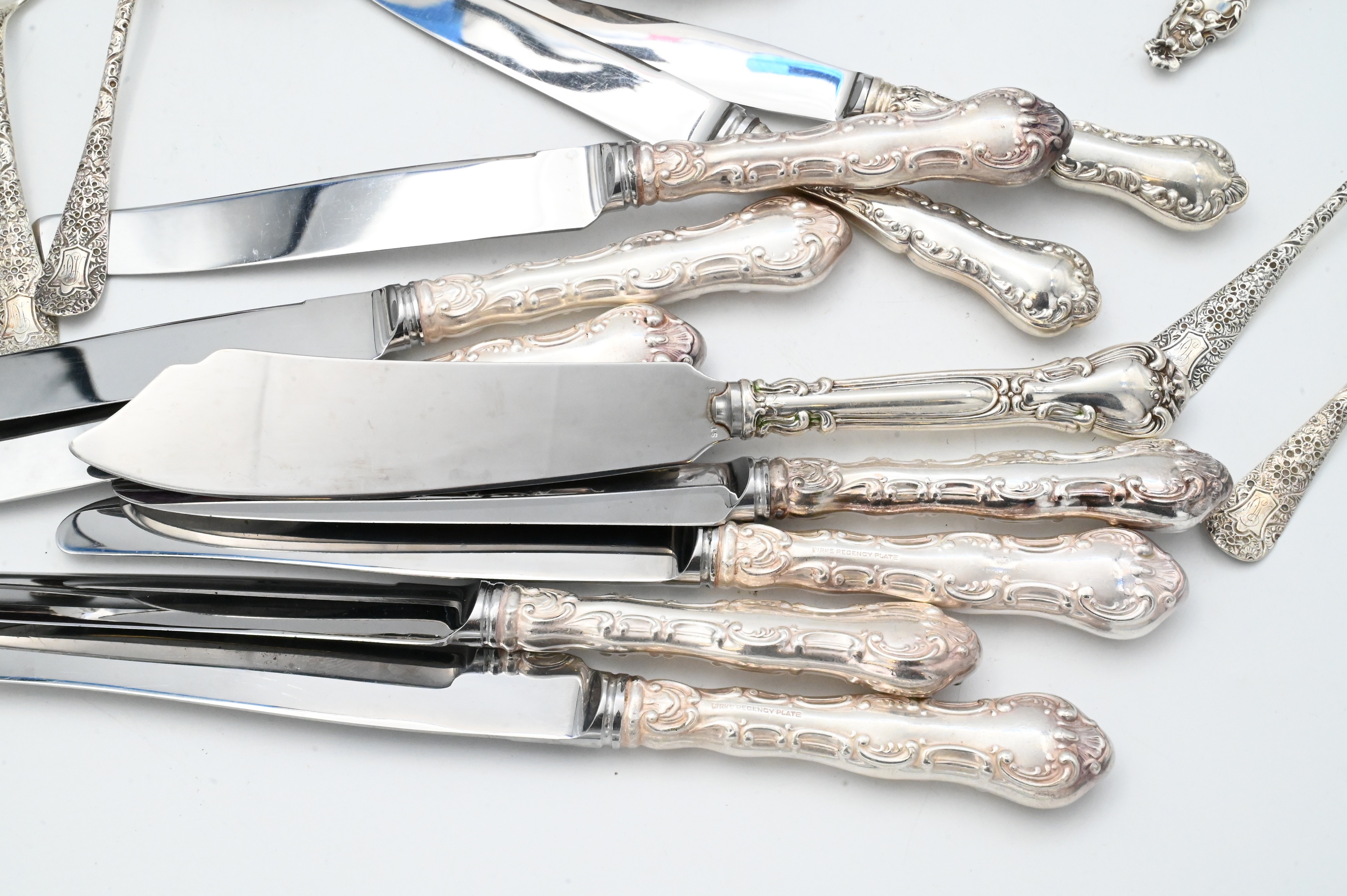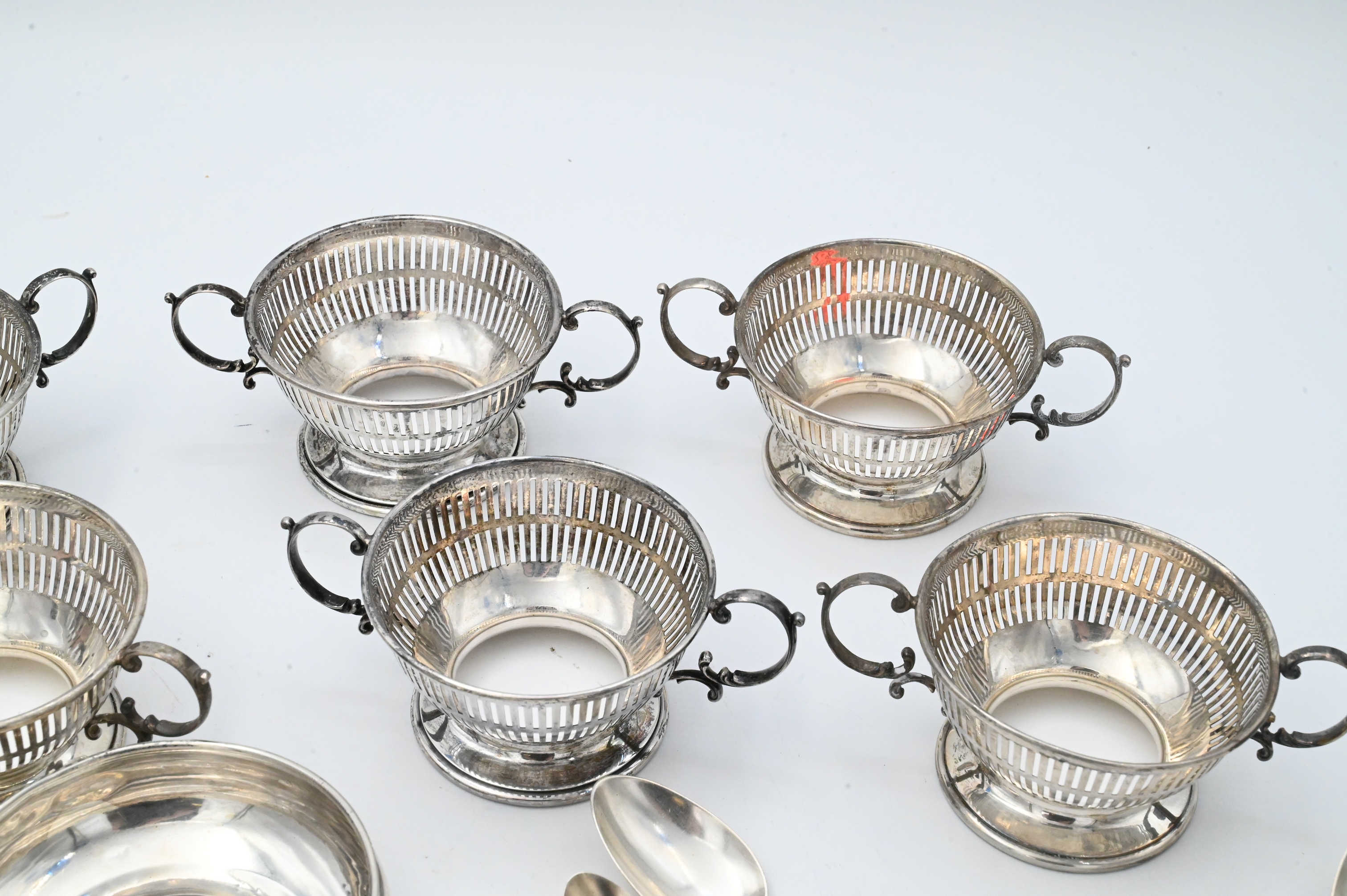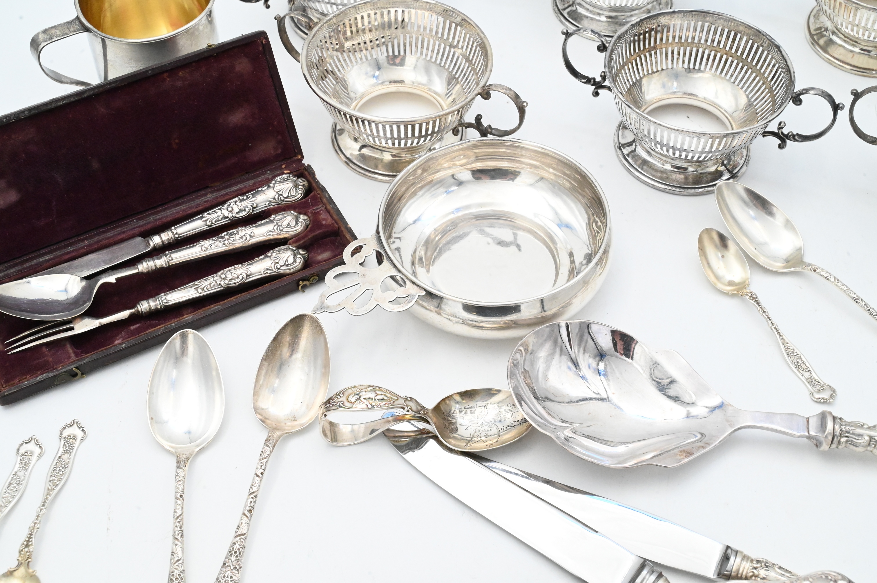 to include six tea cup holders, porrenger, small cup, and flatware, along with silver plate knives