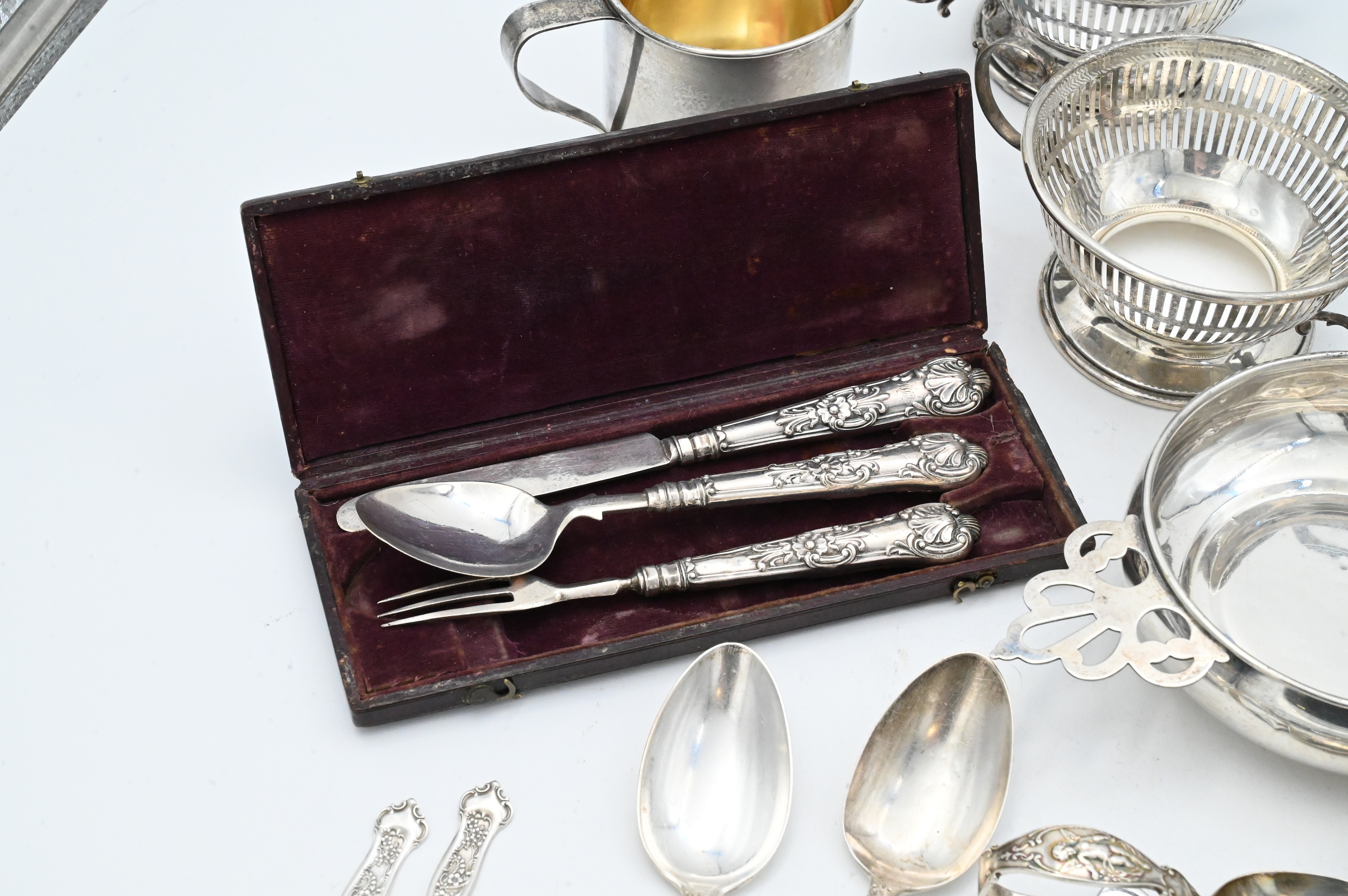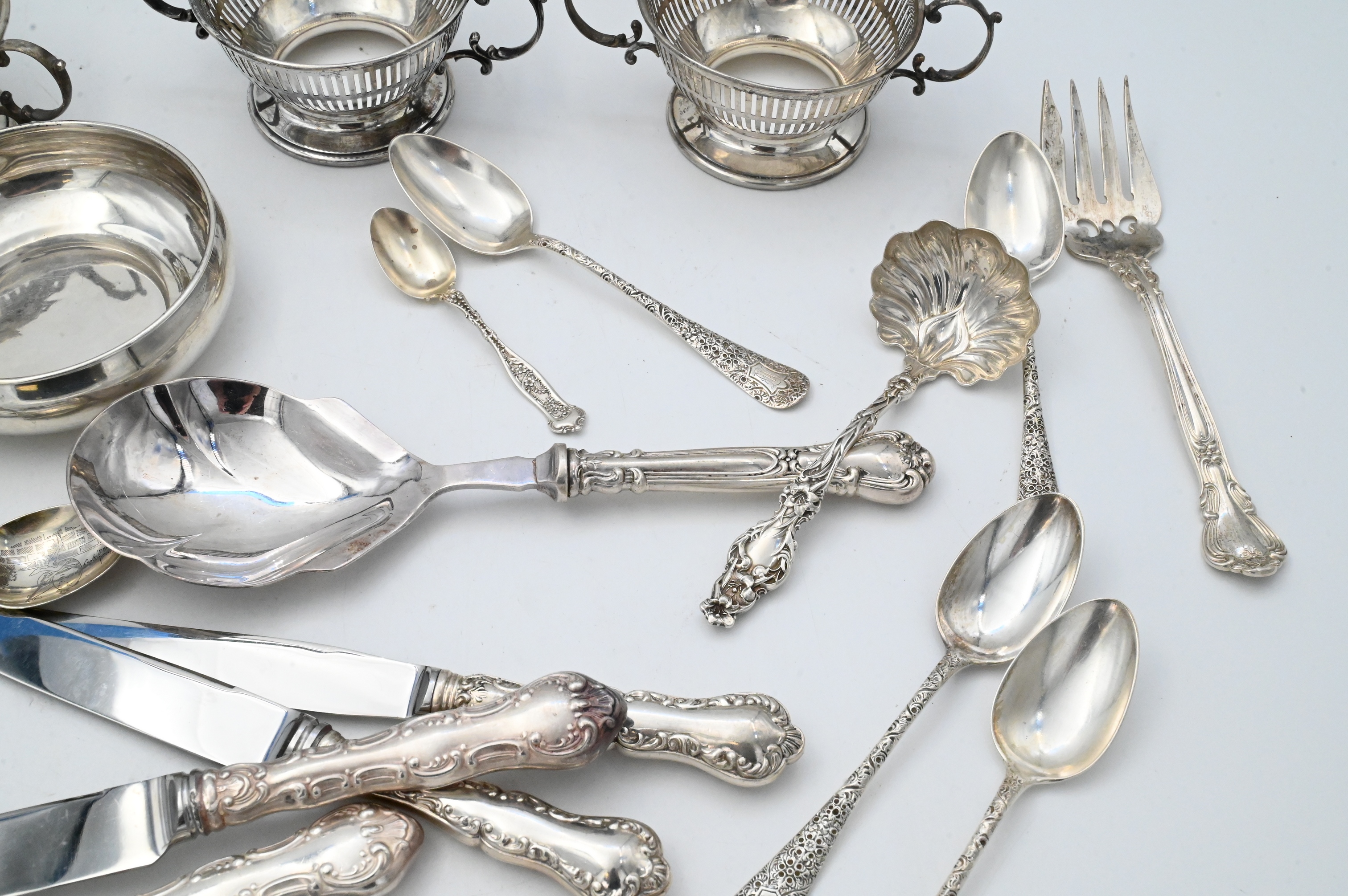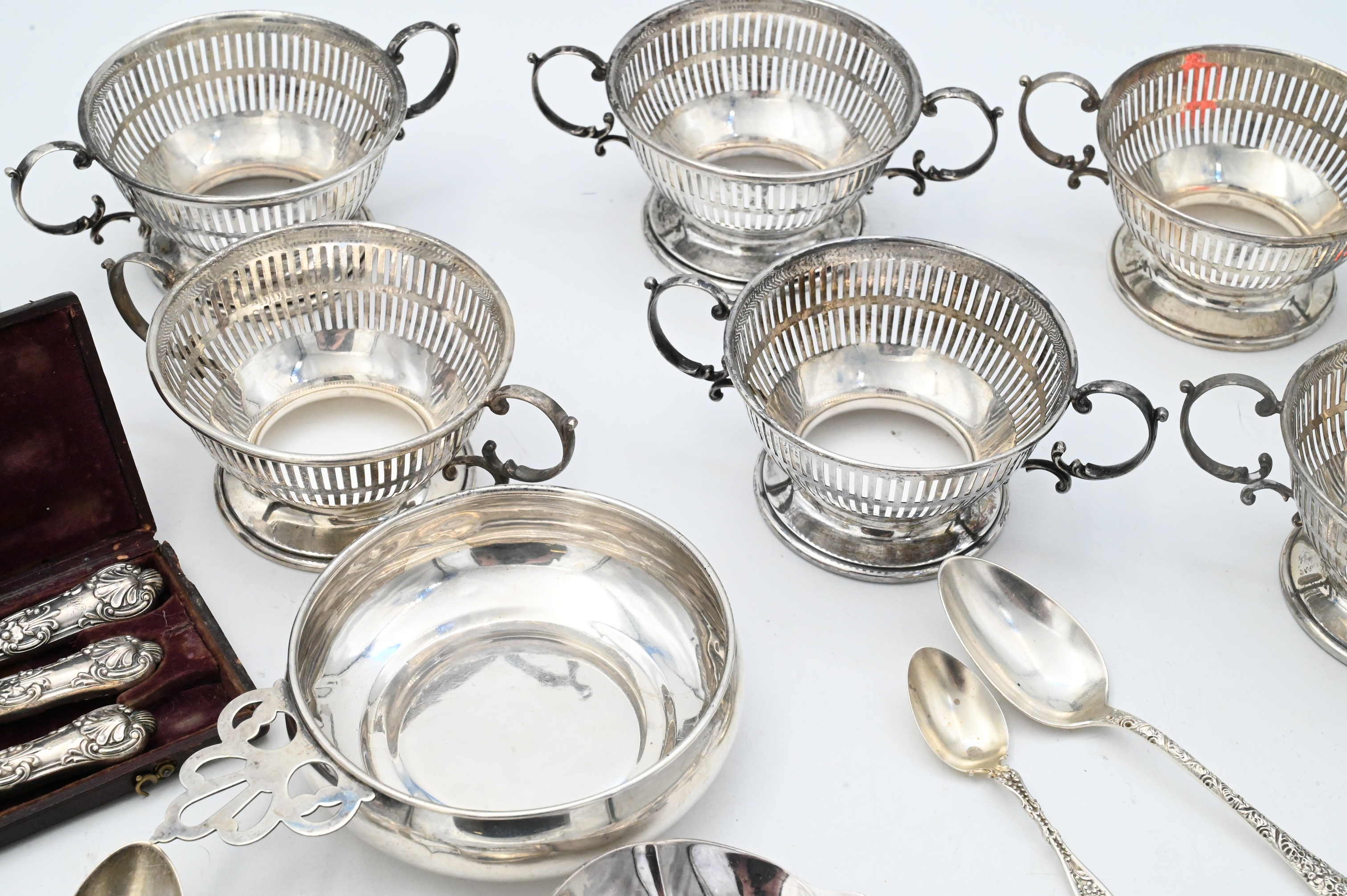 to include six tea cup holders, porrenger, small cup, and flatware, along with silver plate knives