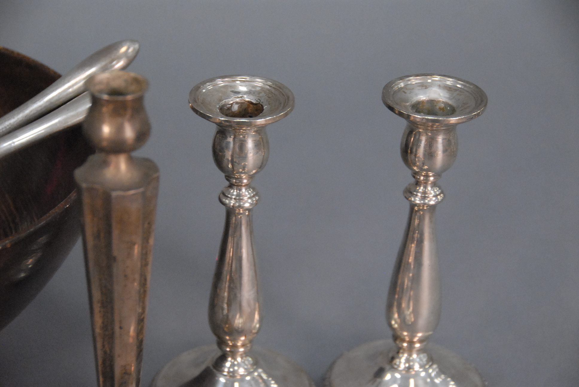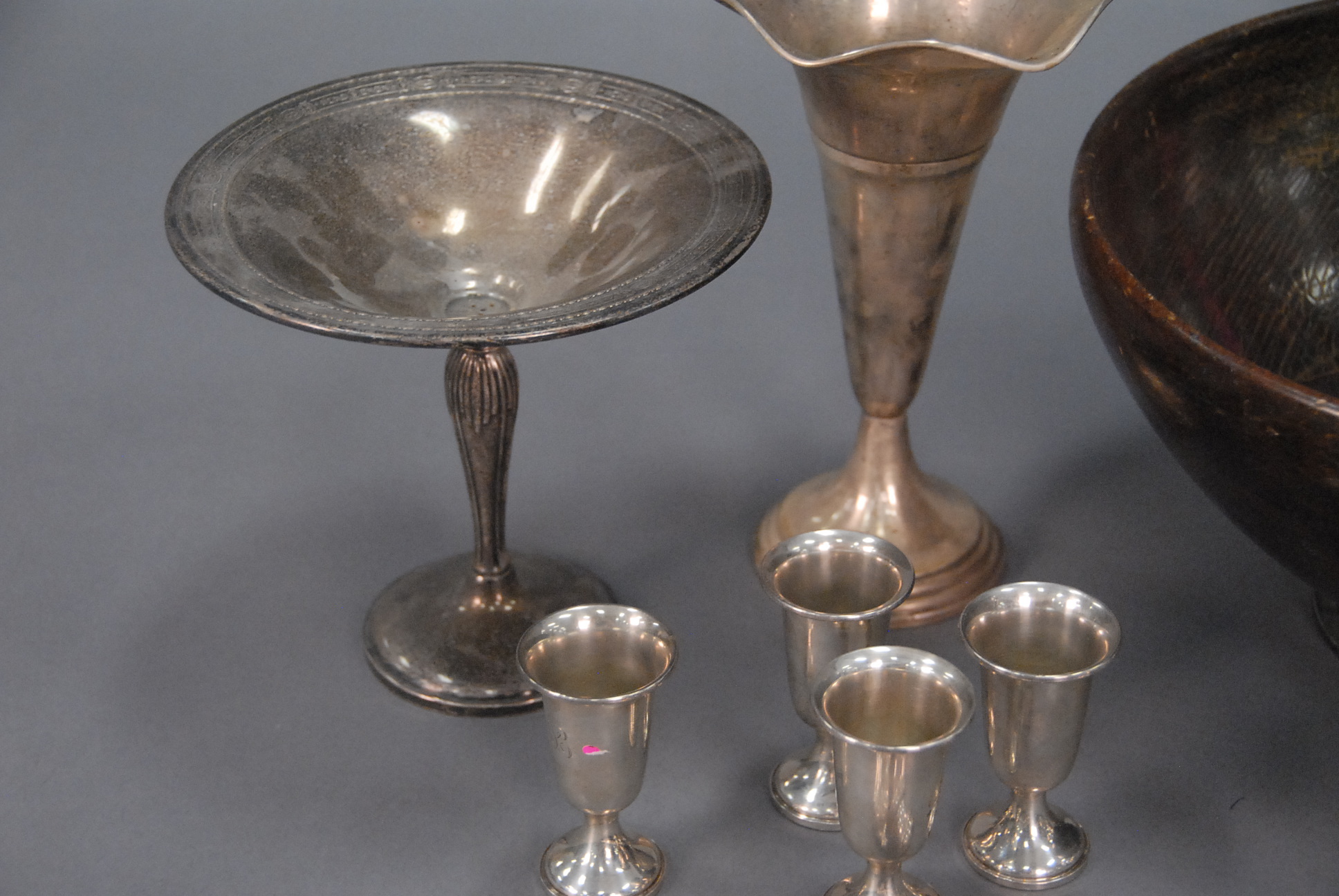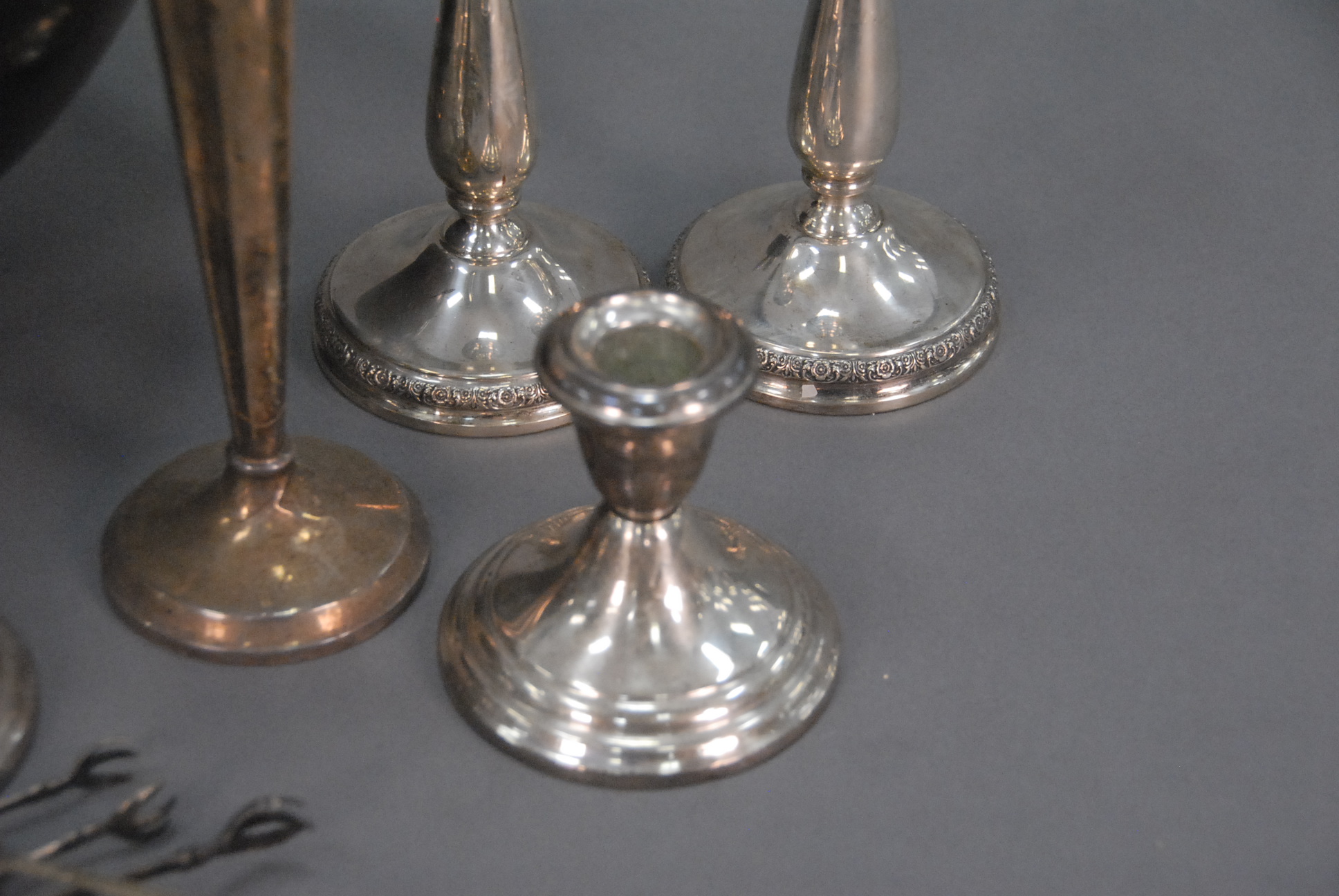 Group of weighted silver four candlesticks, one sterling vase, compote, weighted sterling handles from serving pieces, wooden bowl with sterling base, and miscellaneous silver plated items.