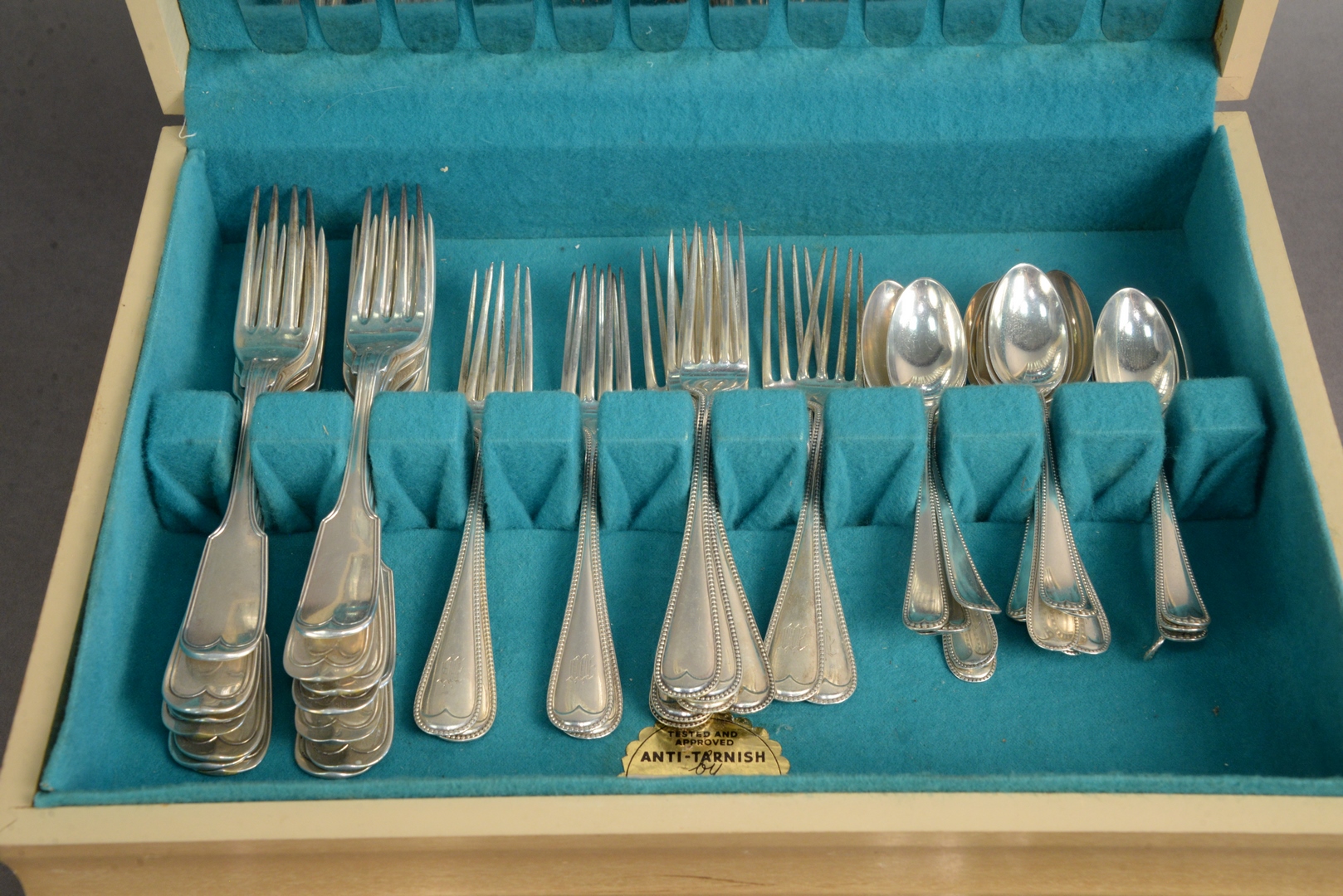 Lot 5: Large Group of Silver and Sterling Flatware, to include a partial set of sterling, 33.7 t.oz.; a partial set of silver flatware, marked 800, 28.9 t.oz.; along with 12 weighted handles. Provenance: From a Newport, Rhode Island historic home, in the sa