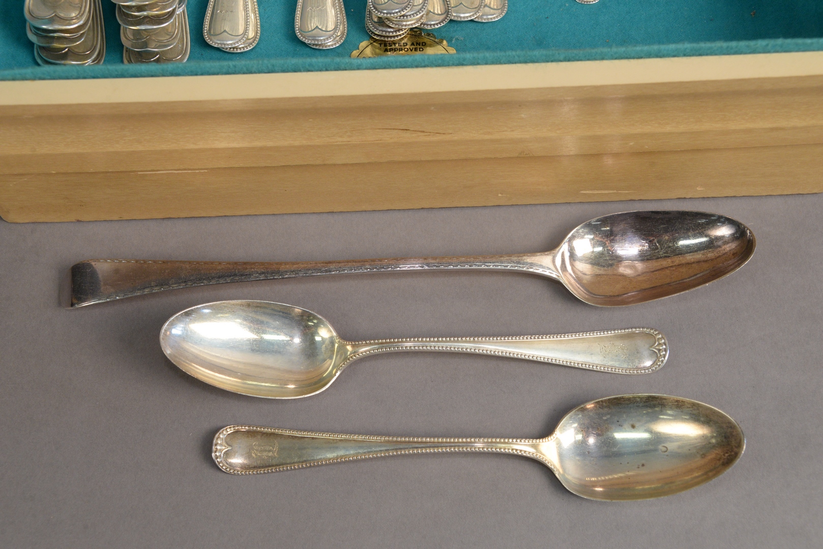 Large Group of Silver and Sterling Flatware, to include a partial set of sterling, 33.7 t.oz.; a partial set of silver flatware, marked 800, 28.9 t.oz.; along with 12 weighted handles. Provenance: From a Newport, Rhode Island historic home, in the same family since 1761.