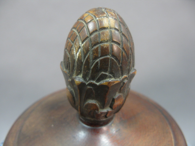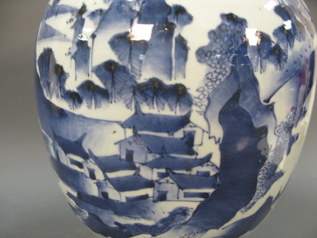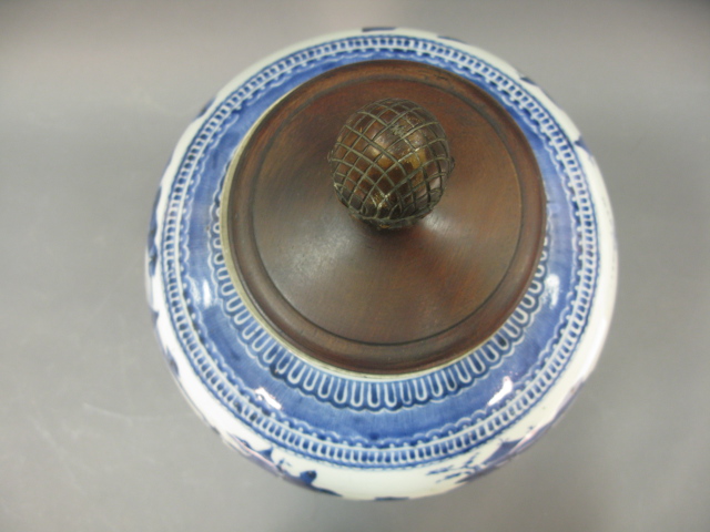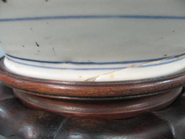 Oriental blue and white large ginger jar having painted landscape scene sitting on carved wooden stand and carved wooden cover crack on foot of jar.
