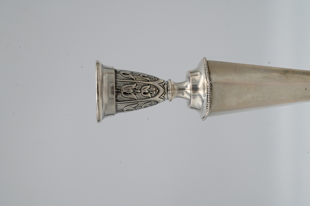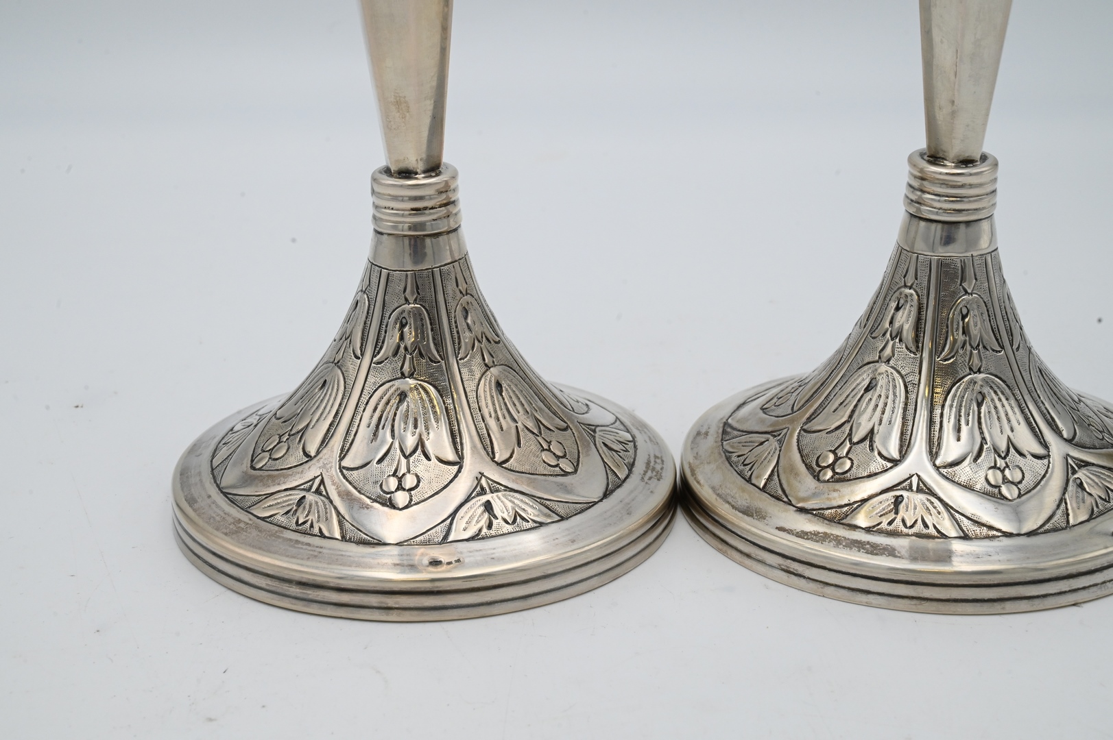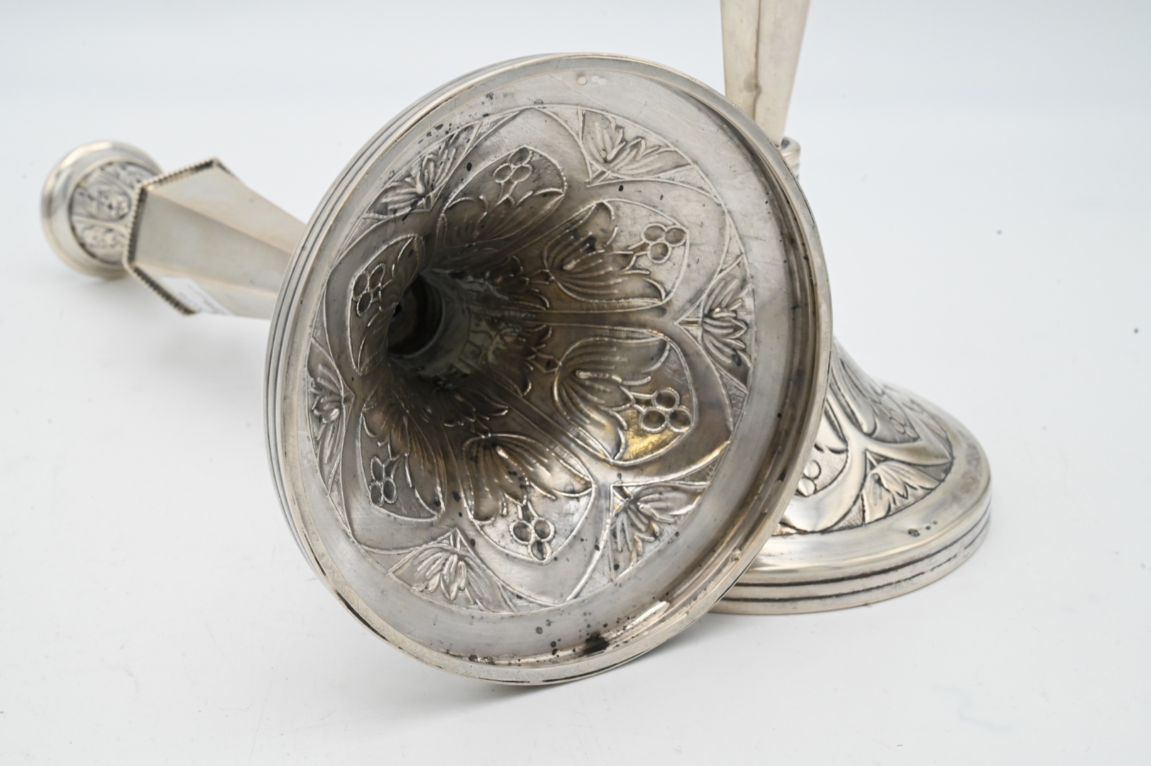 Pair of Silver Candlesticks, bell flower decoration, touch marks on base, height 12 inches, 20.4 t.oz.