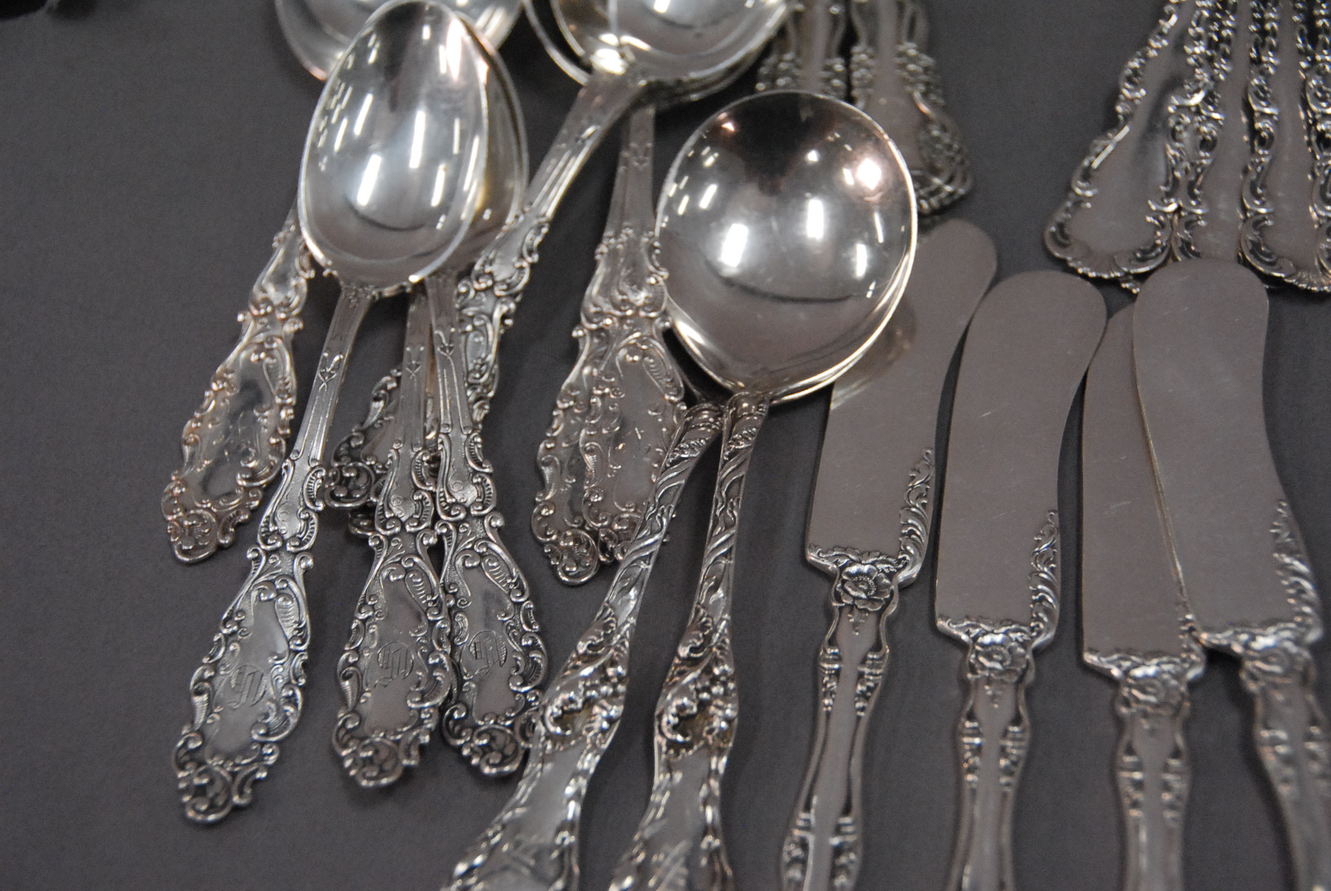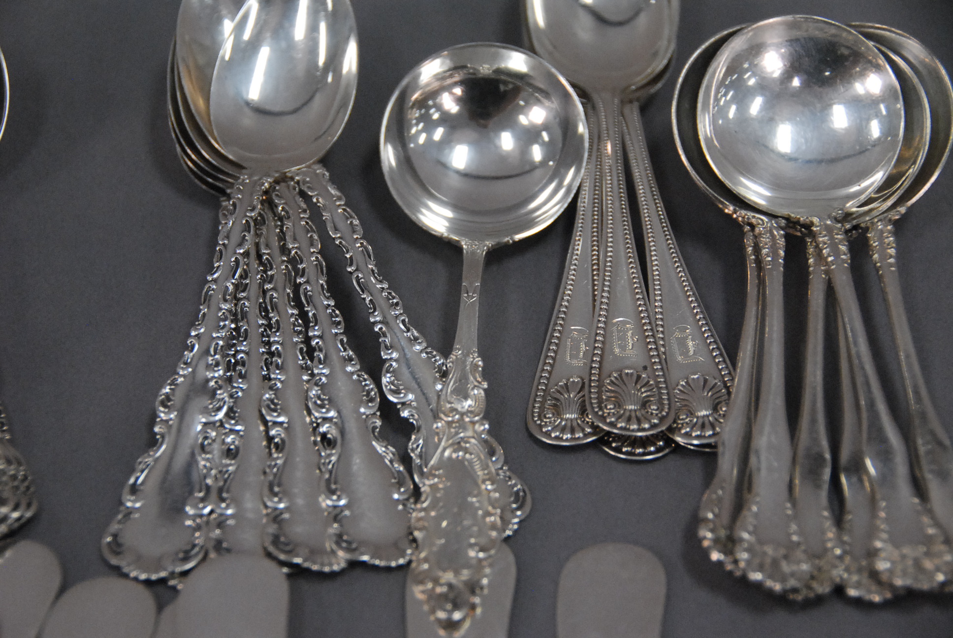 Several partial sets of silver teaspoons, soup spoons, and butter knives, 23.6 t oz.