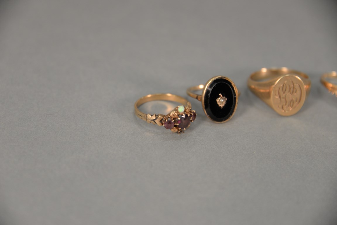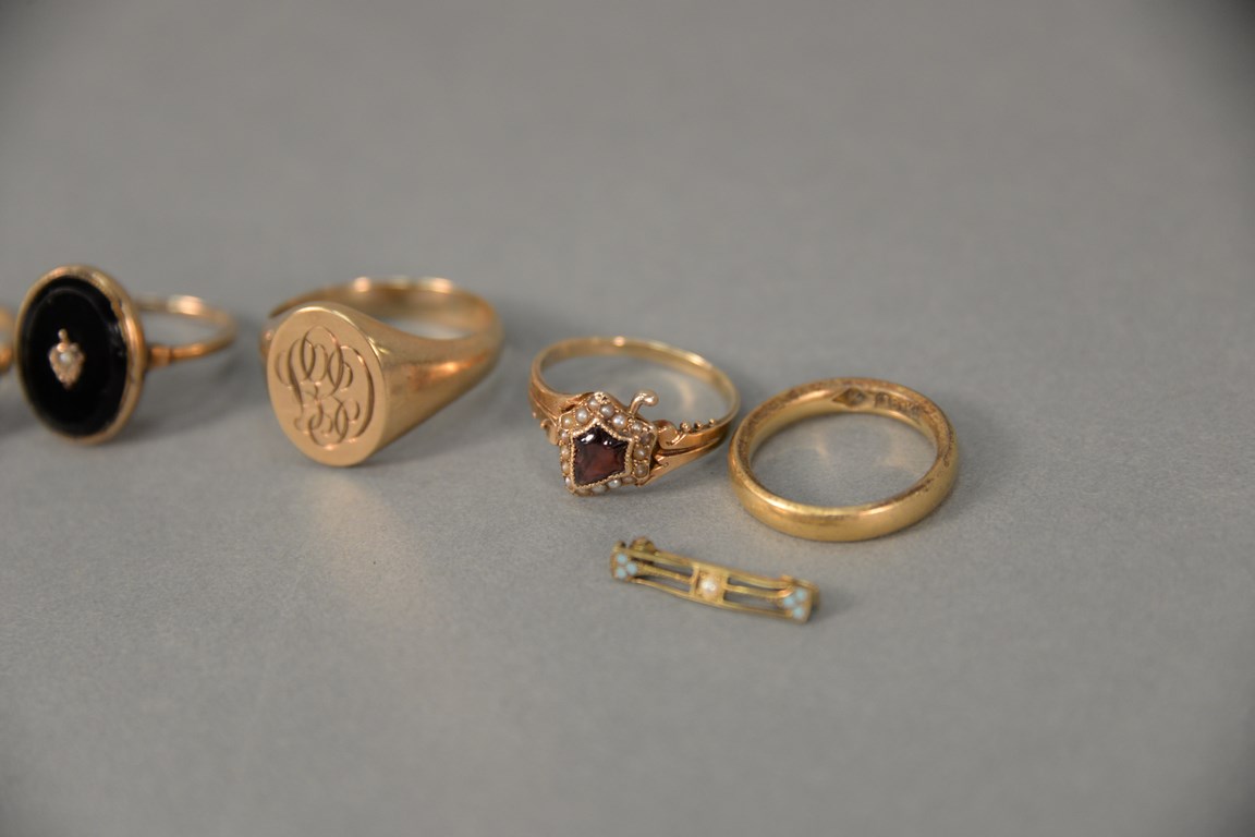 Six piece lot to include five 14K gold rings, one ring with 18K gold band, and one small bar pin. 17.8 grams total weight 14K, and 5.5 grams 18K