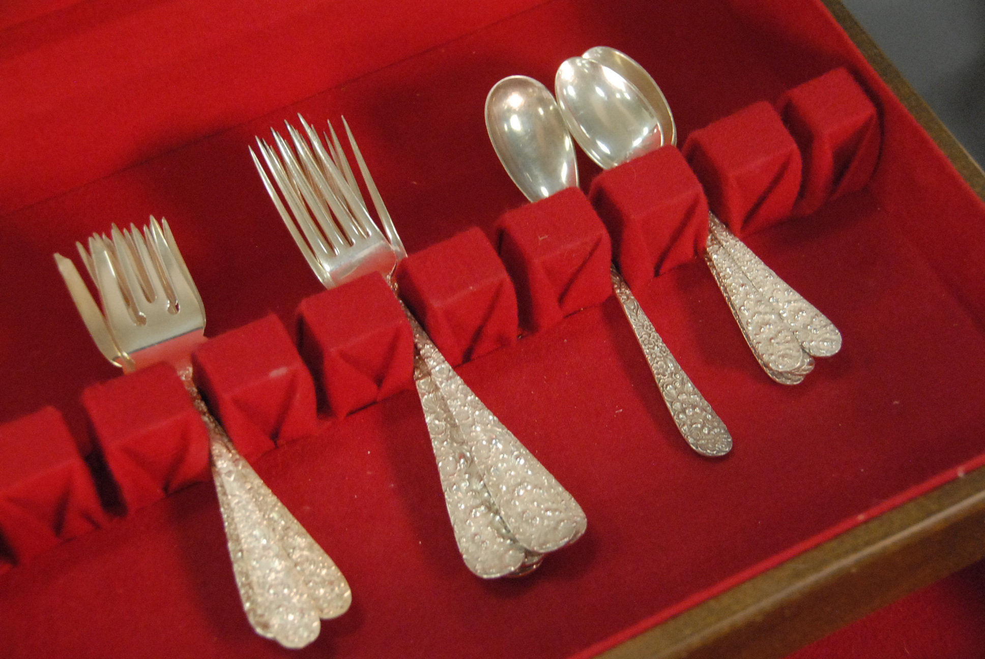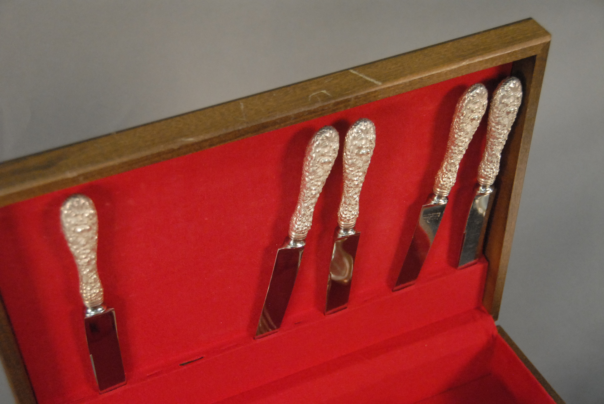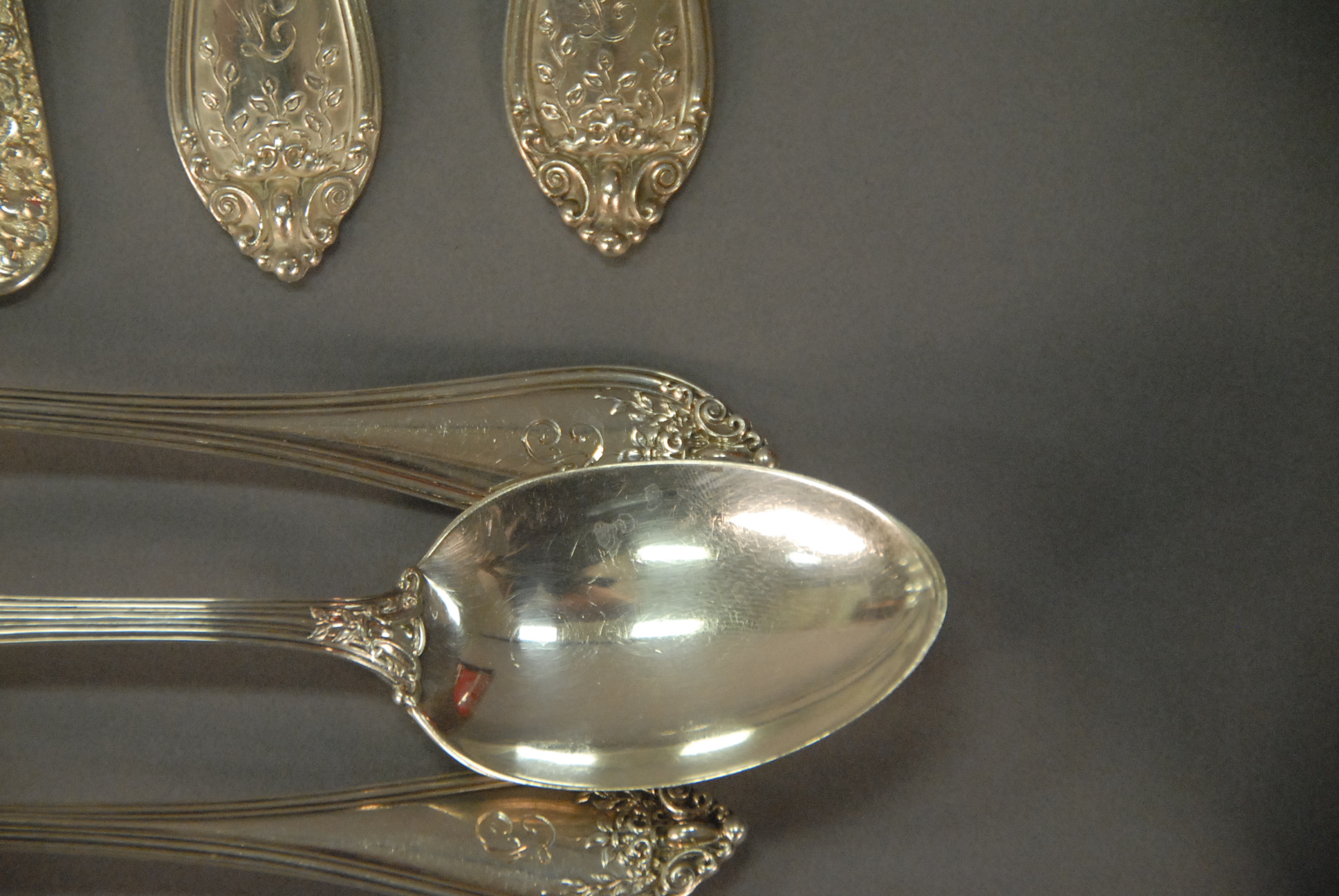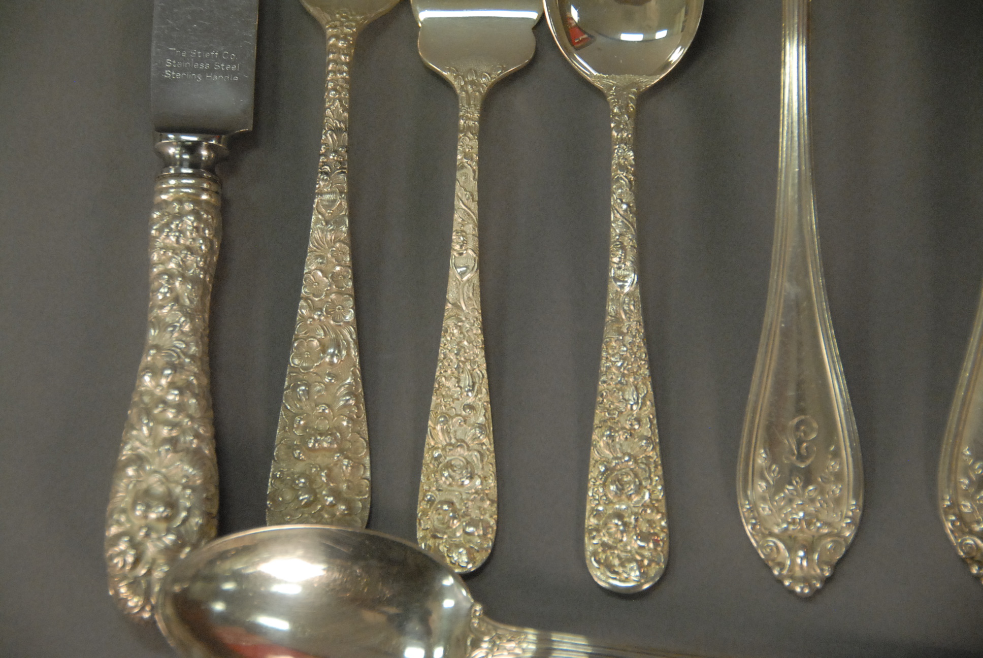 Lot 5: Stieff sterling silver partial flatware set to include six dinner forks, six salad forks, six teaspoons, six knives, small spoon, along with five serving spoons with different pattern. 32.2 troy ounces weighable silver plus six weighted knives