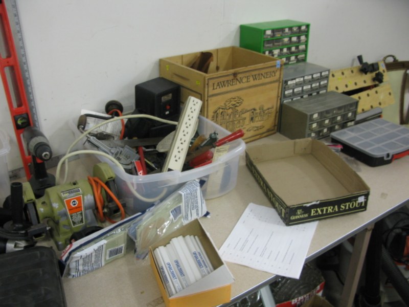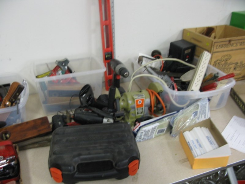 Table lot of hand tools to include wrenches, hammers, grinder, screw gun, drill, level, squares, nuts, bolts etc