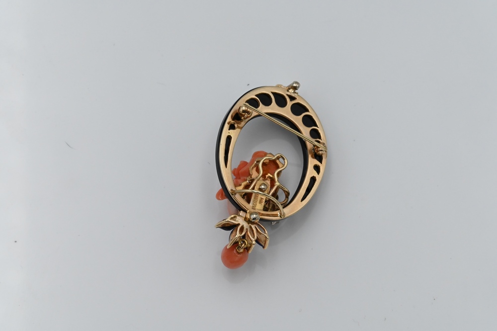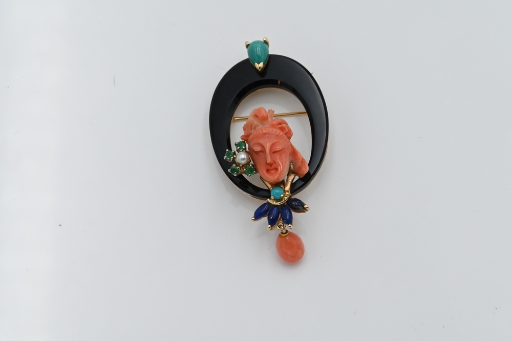 Lot 5: Tambetti 14 Karat Gold Brooch/Pendant, mounted with pink coral face and various stones, height 2 inches.