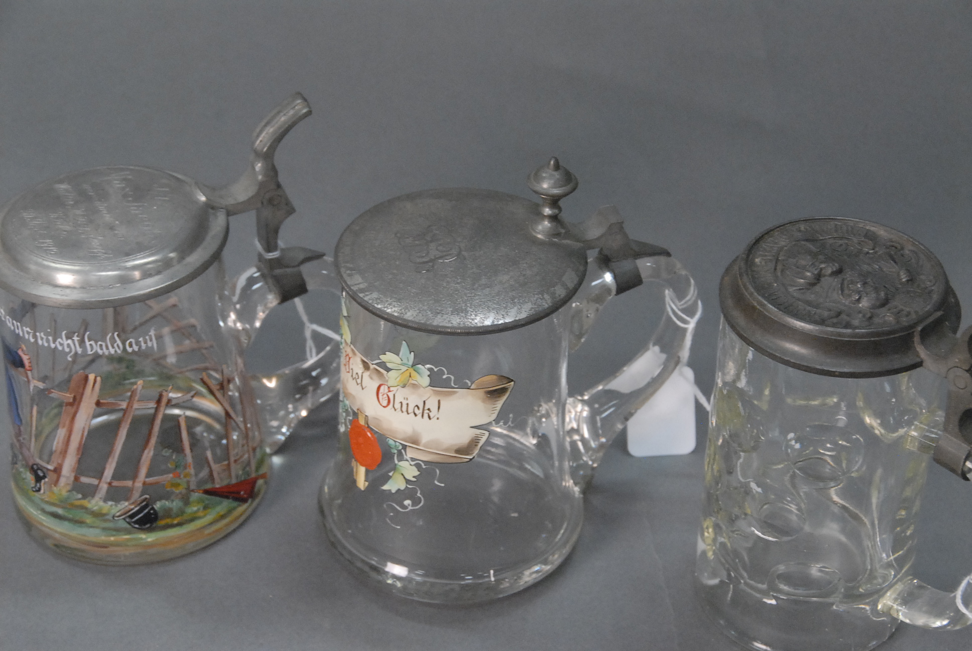 Three clear glass steins with pewter tops, two with enameled scenes, tallest: ht. 7in.