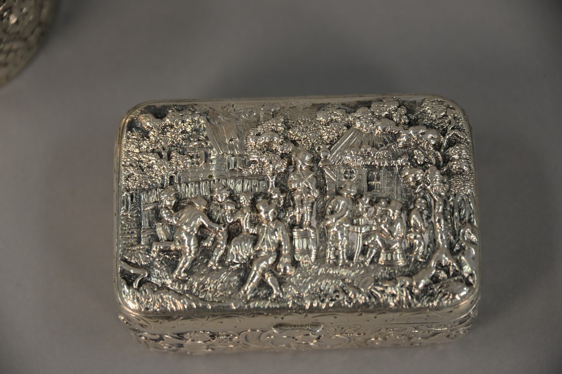 Lot 5: Two sterling silver repousse boxes including figural box and a Kirk & Sons floral round box. ht. 1 1/2in., lg. 3 1/2in. & ht. 3in.,…