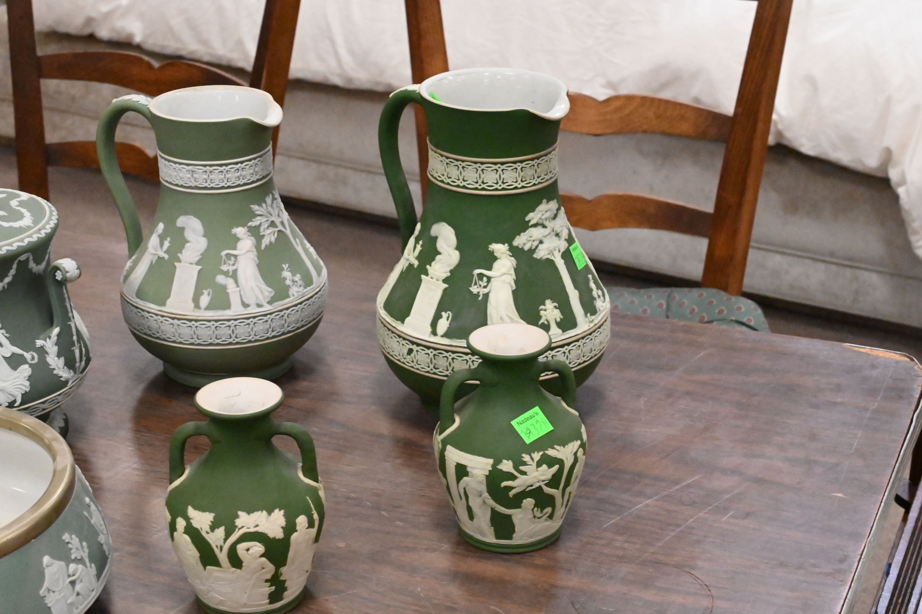 pitchers, small vases, triple handle mug, candleholder, bowl, tray, and other forms, decorated with white neoclassical relief figures and foliate borders