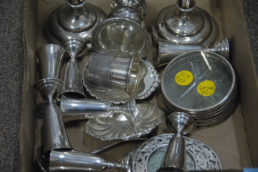 Box lot of sterling silver, weighted and unweighted, 11.7 troy ounces of weighable silver plus weighted pieces.