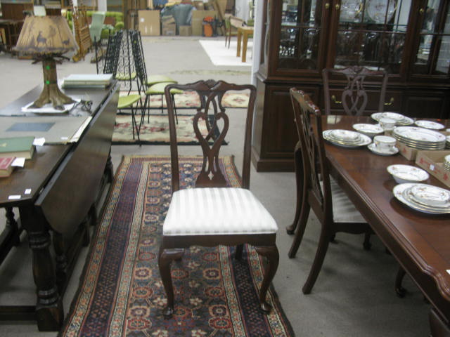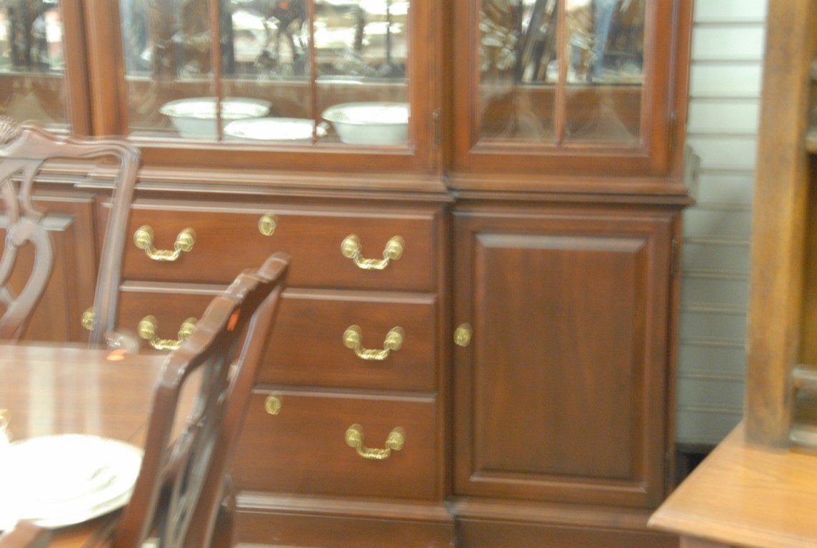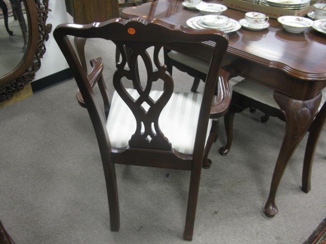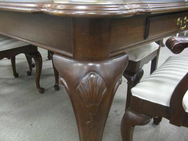 Cherry Ethan Allen shaped dining table and six Queen Anne style chairs with pads