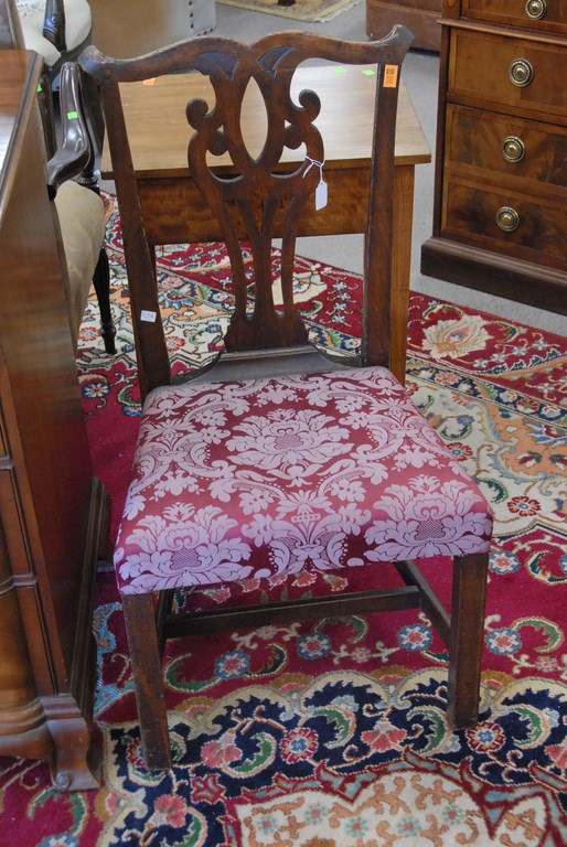 Chippendale mahogany side chair with pierced splat and fully upholstered seat on square legs, 18th century.