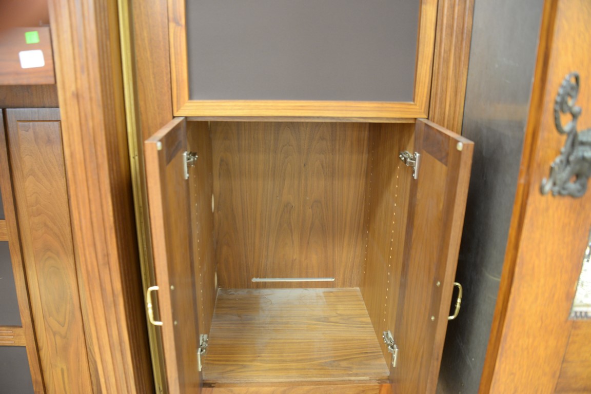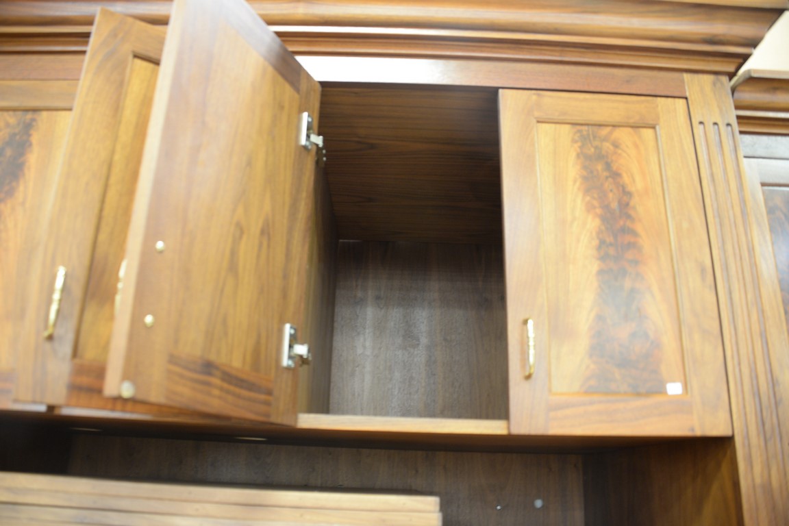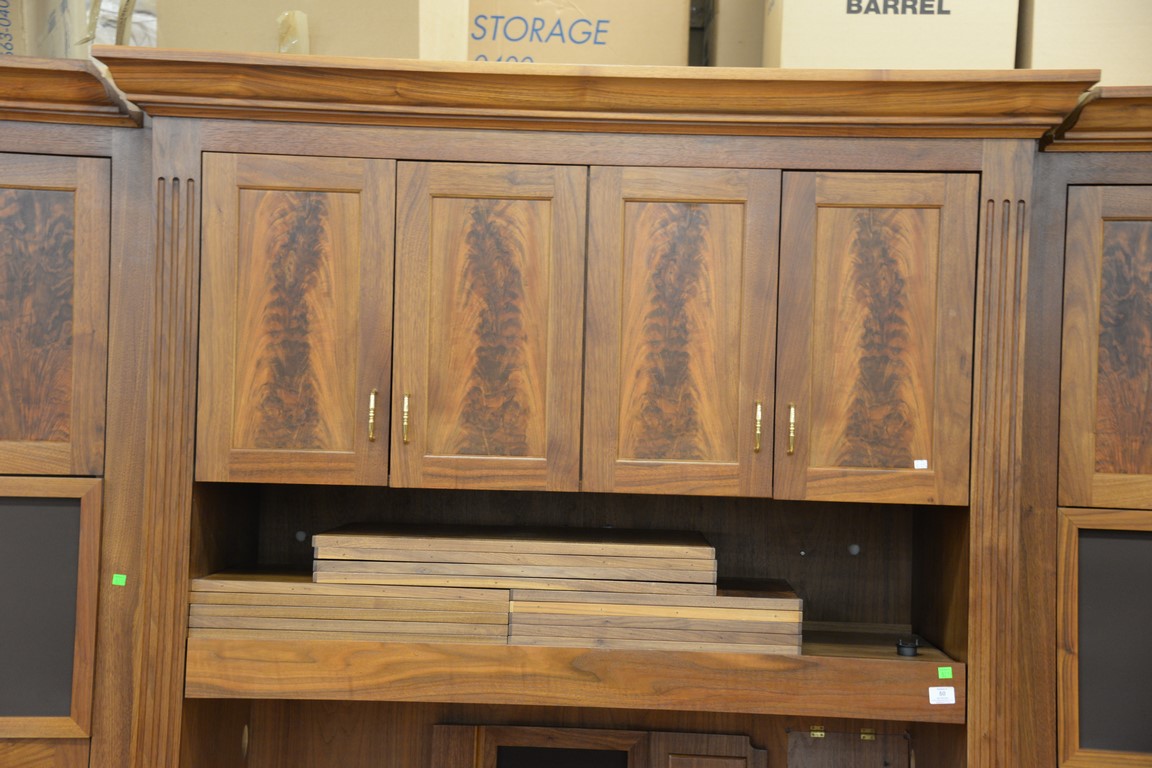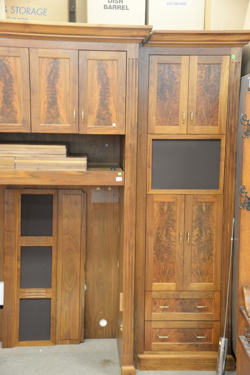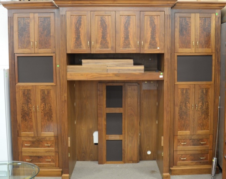 Custom made walnut and burl walnut TV cabinet. ht. 95in., wd. 115in., dp. 21in.