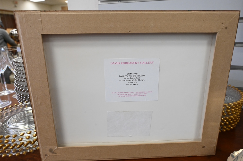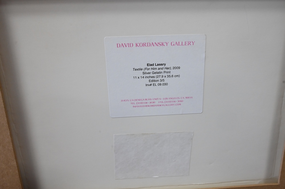 Elad Lassry (b. 1977), Textile (For Him and Her), 2009, silver gelatin print, edition 3/5, David Kordansky Gallery label on verso, 11″ x 14″. Provenance: Property from the Estate of Anita and Burton Reiner.