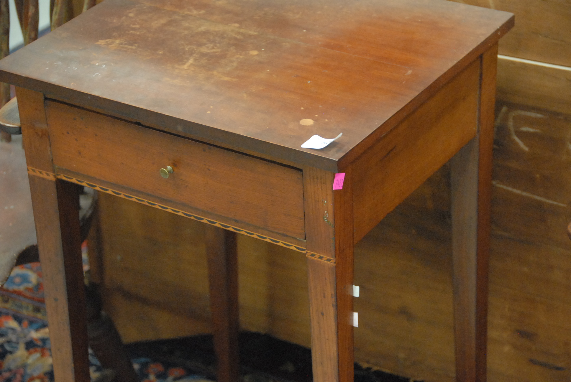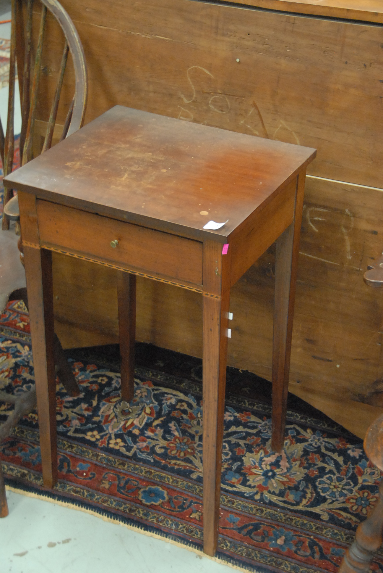 Lot 50: Federal cherry stand having one drawer and inlaid edge, all set on square tapered legs, circa 1790-1810. ht. 28 in. top: 15 x 17 Provenance: Property from the Estate of Elizabeth and Edward Wallace of The Tracy House in Meriden, Conn