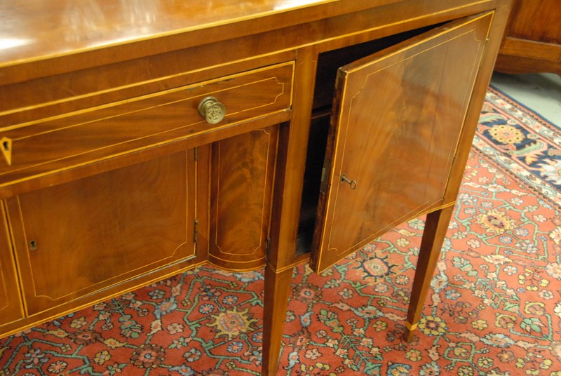 Federal mahogany sideboard having one central drawer over two doors flanked by two doors, set on square tapered legs with line inlays, ht. 39 1/2 in. lg. 73 1/2 in. dp. 25 1/2 in.
