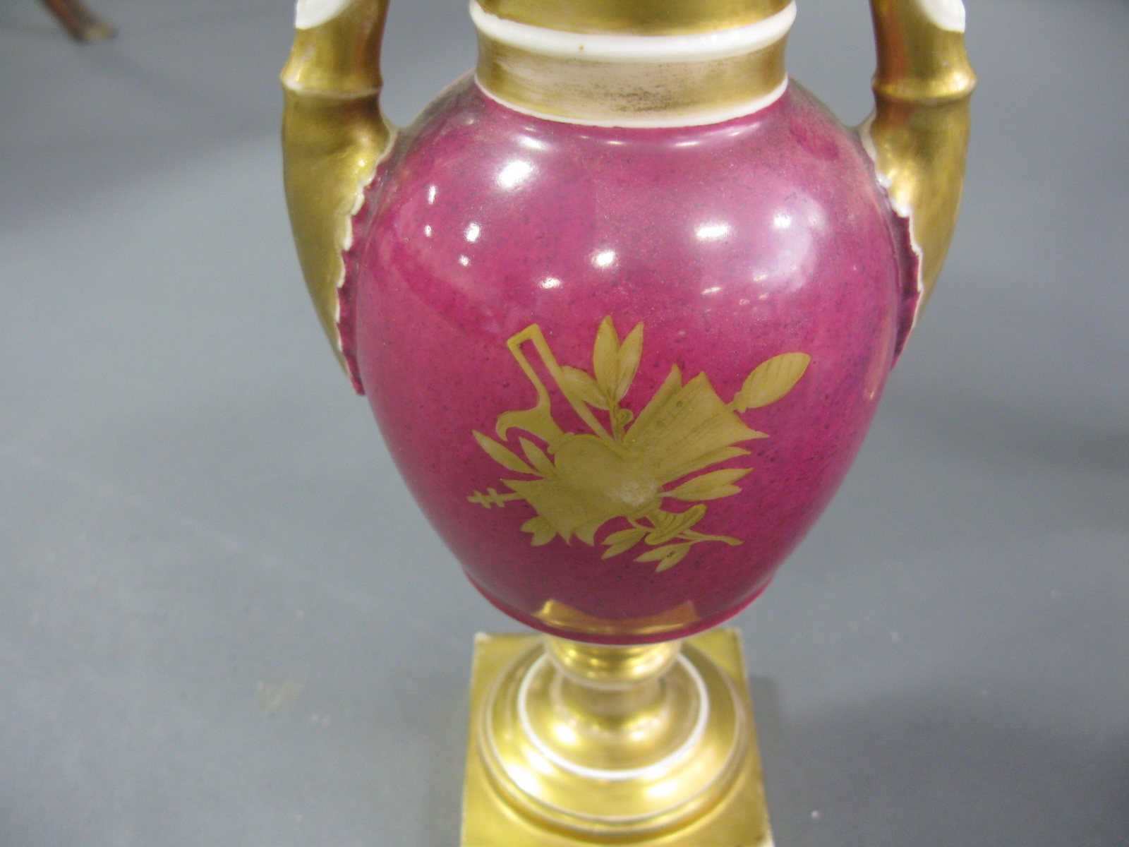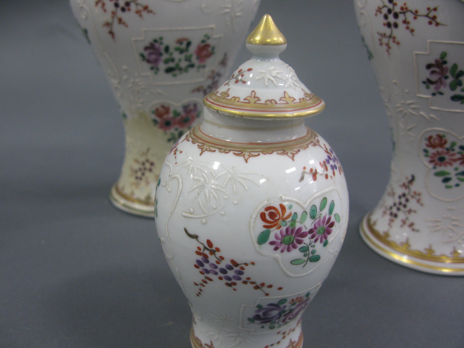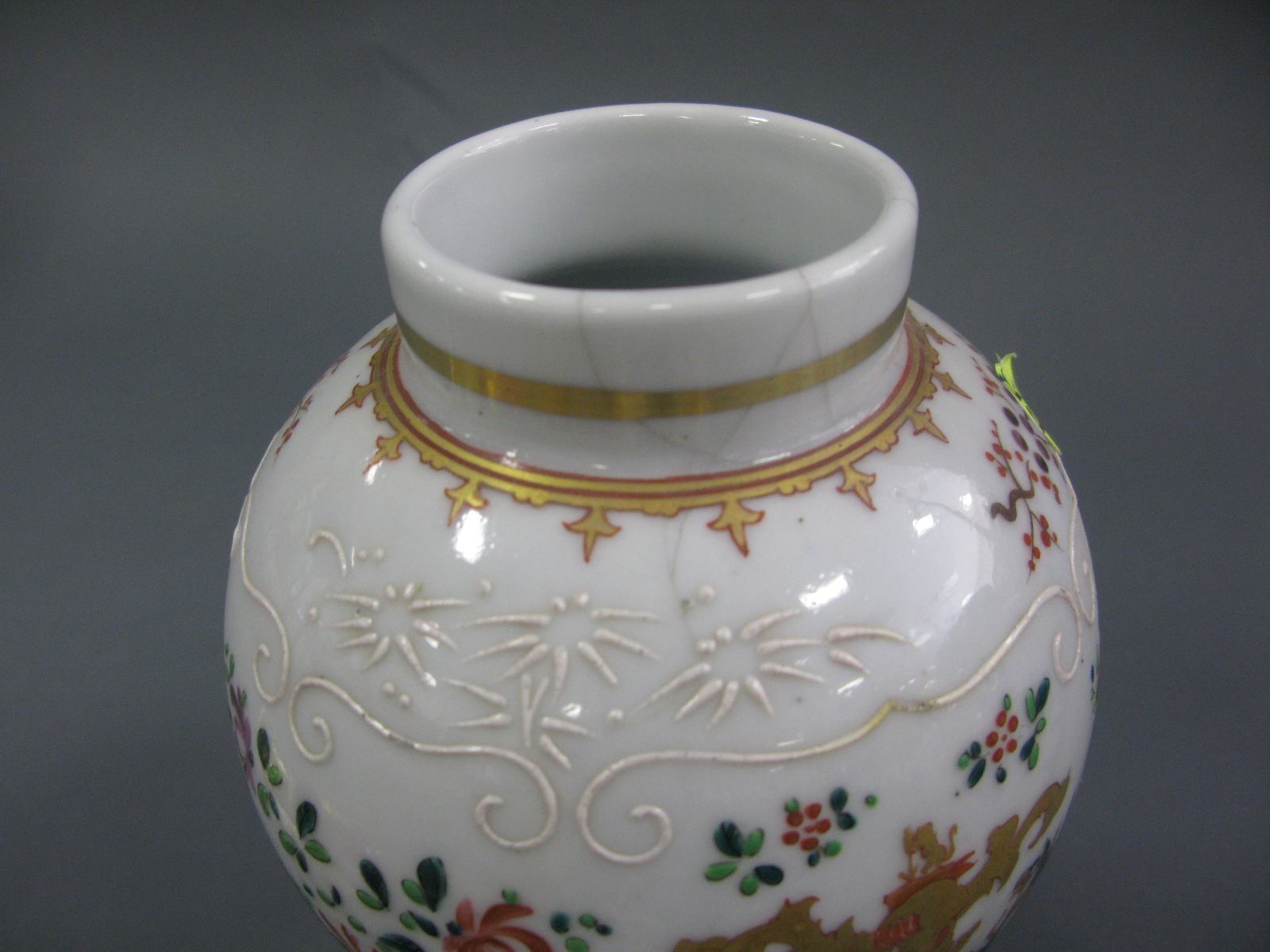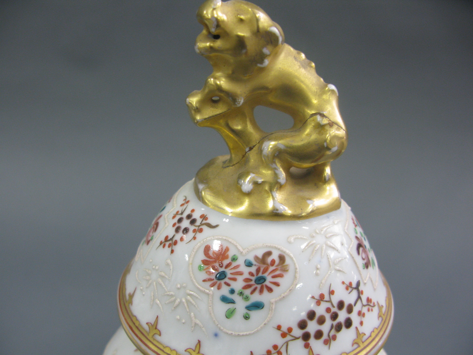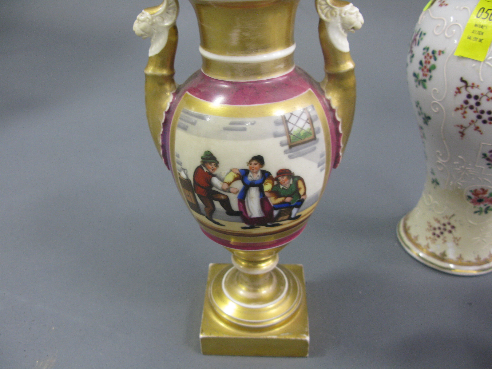 Five piece lot 3 Samson porcelain vases with foo dog finial tops imperfections and pair of French porcelain urns.