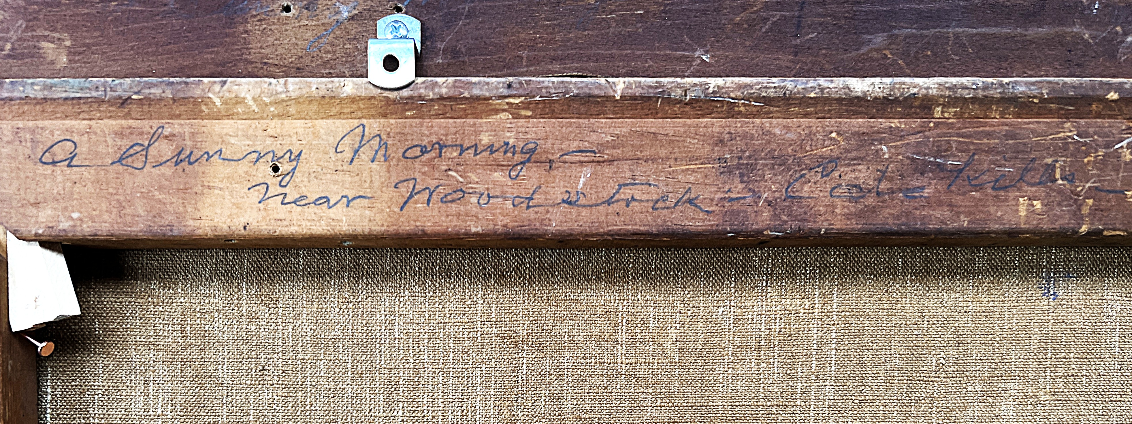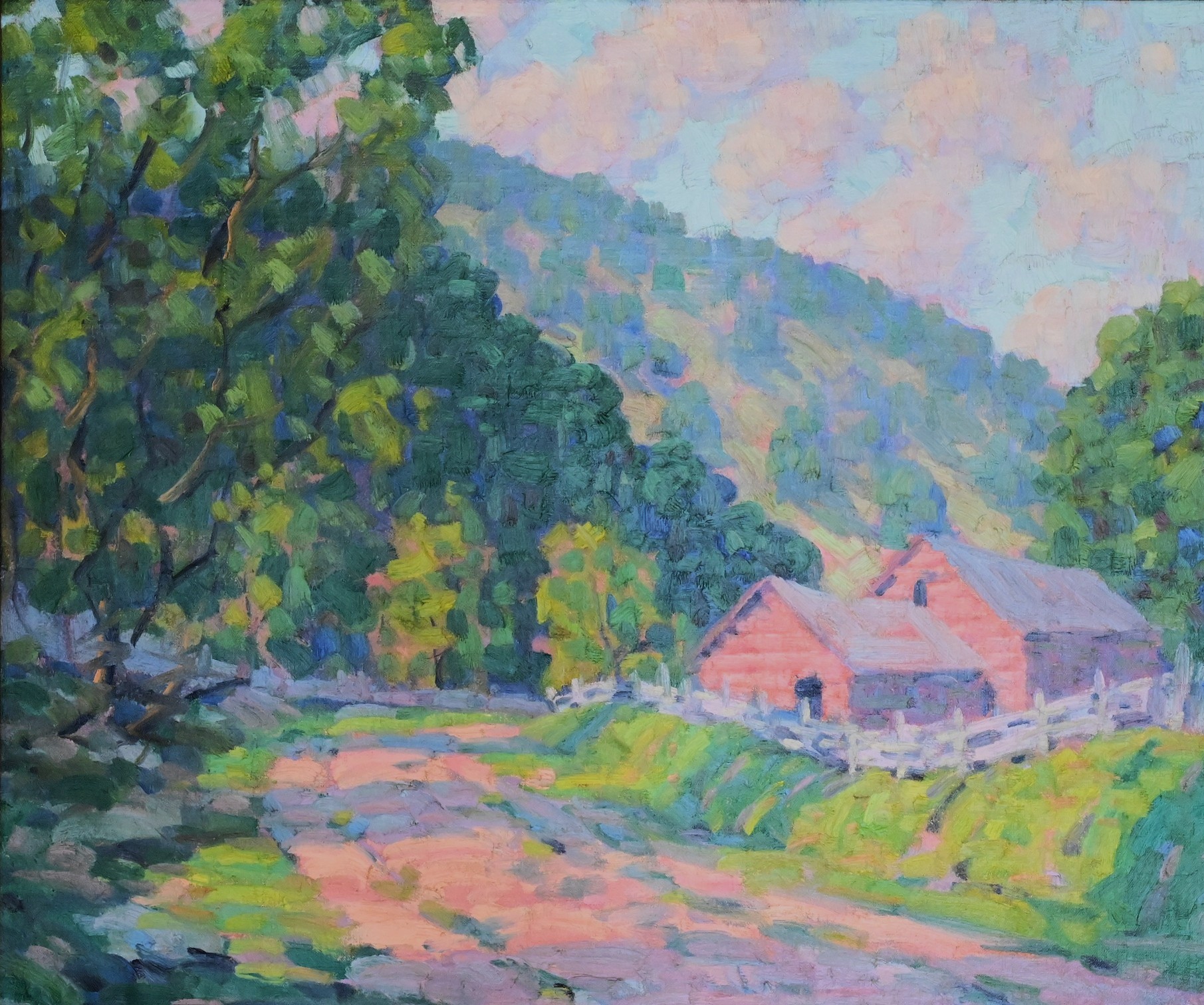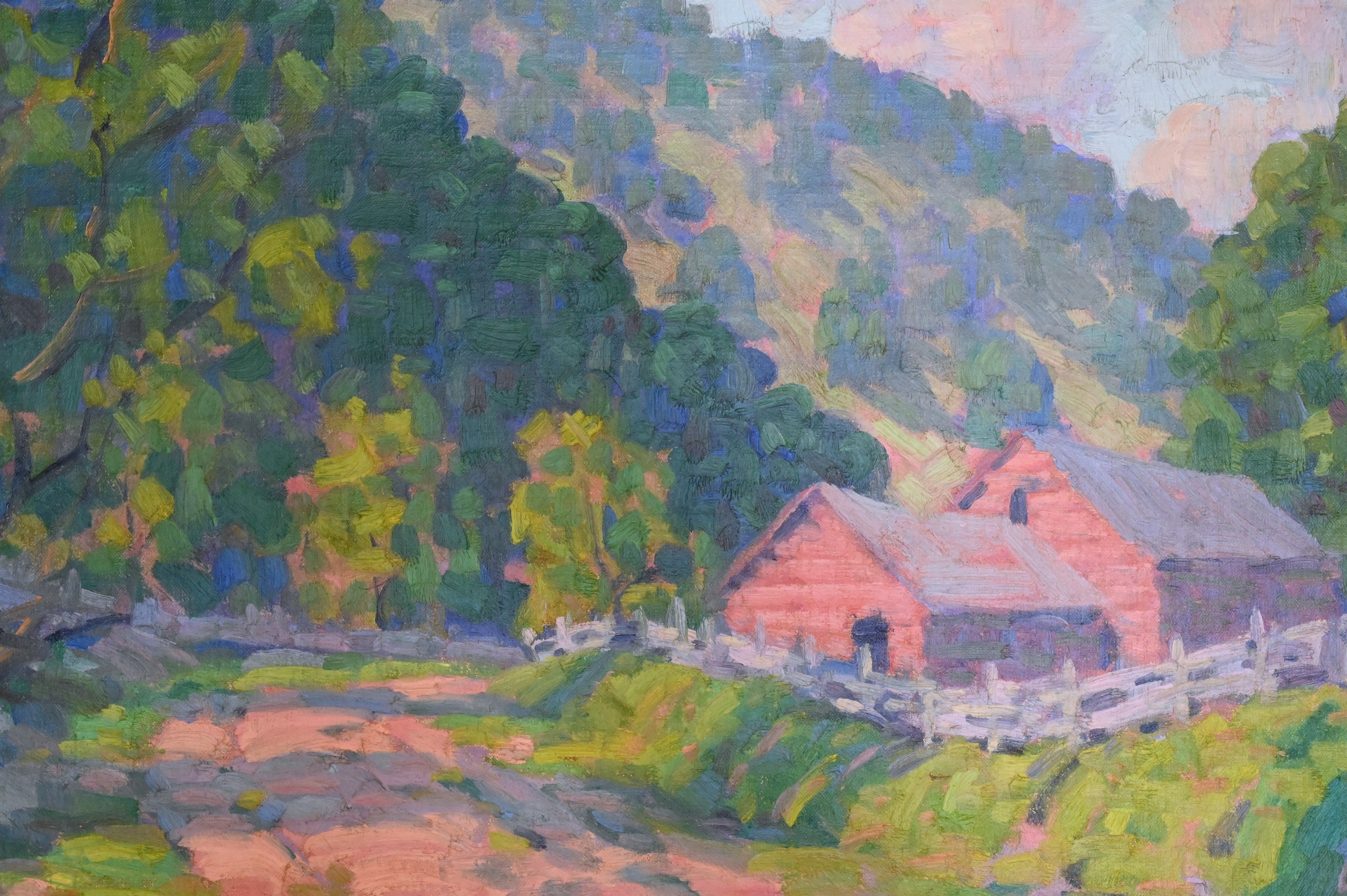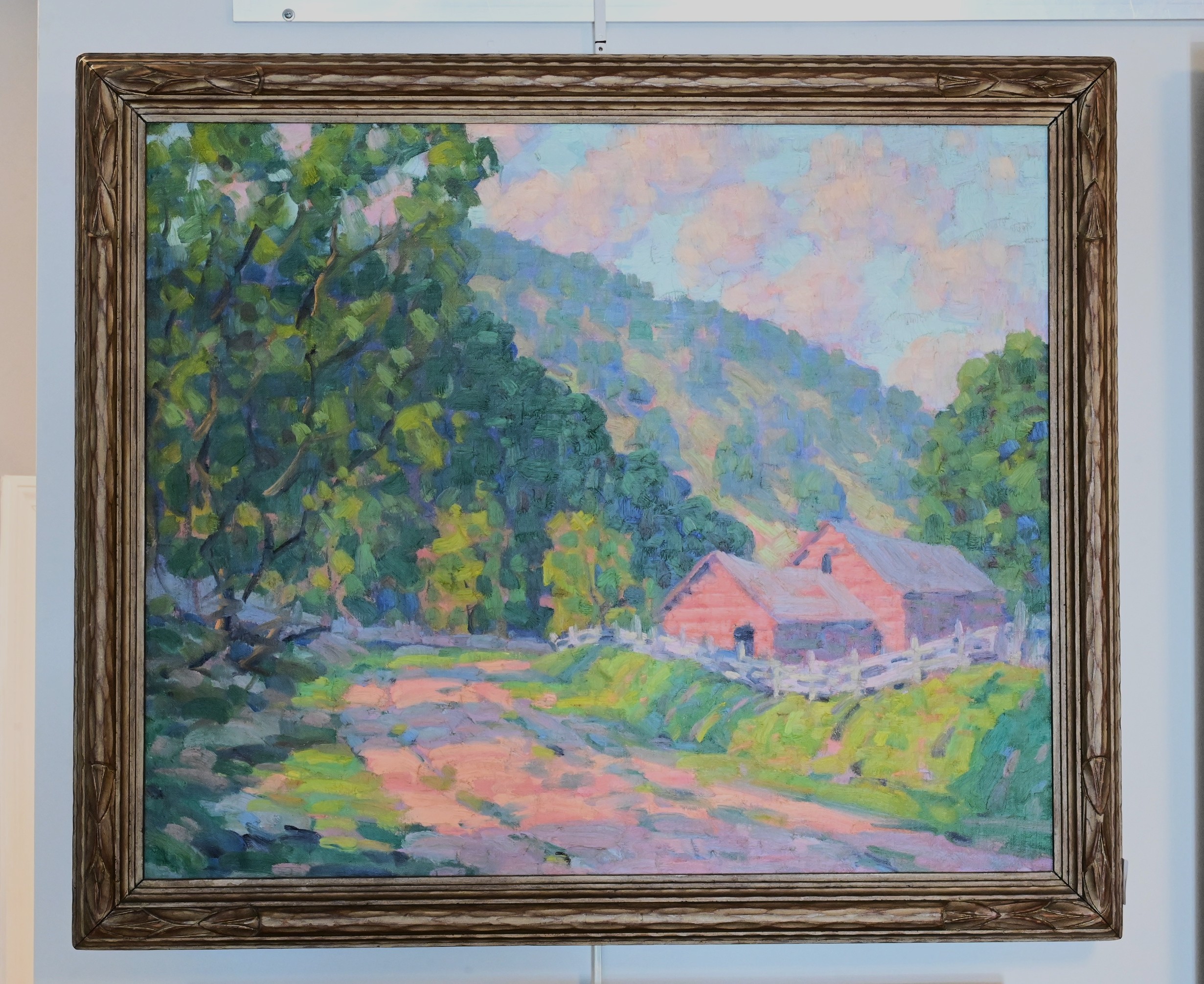 A sunlit Catskills landscape depicting a dirt road winding past red farm buildings set against rolling, tree-covered hills. Executed with purposeful, calculated brushwork with a fresh, high-key palette, the composition captures the clarity and warmth of morning light characteristic of the artist’s regional landscape work.