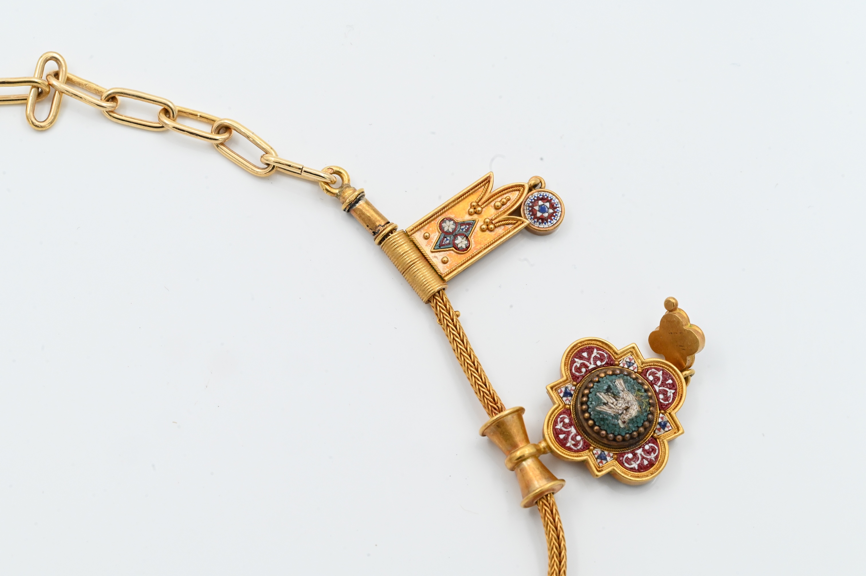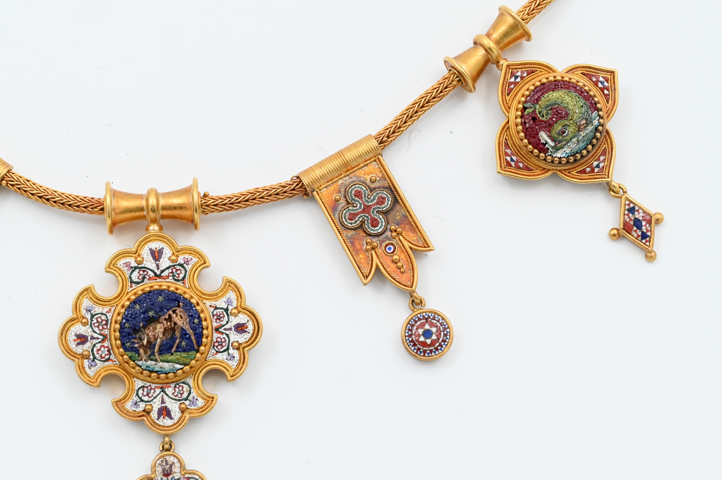 woven gold adorned with drops of micro mosaics depicting animals and fish, Renaissance Etruscan Byzantine, Papal States hallmark, end chain is replacement