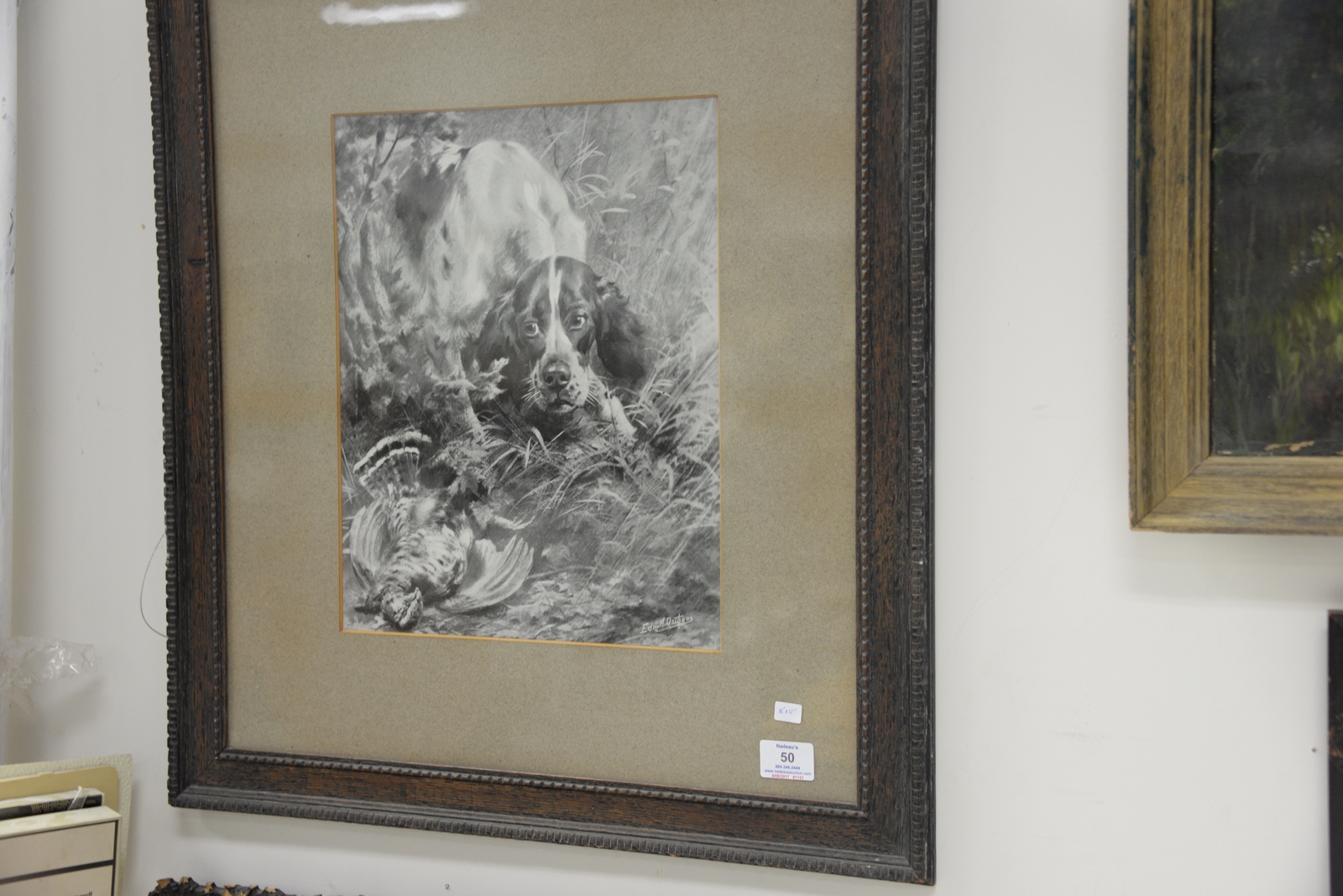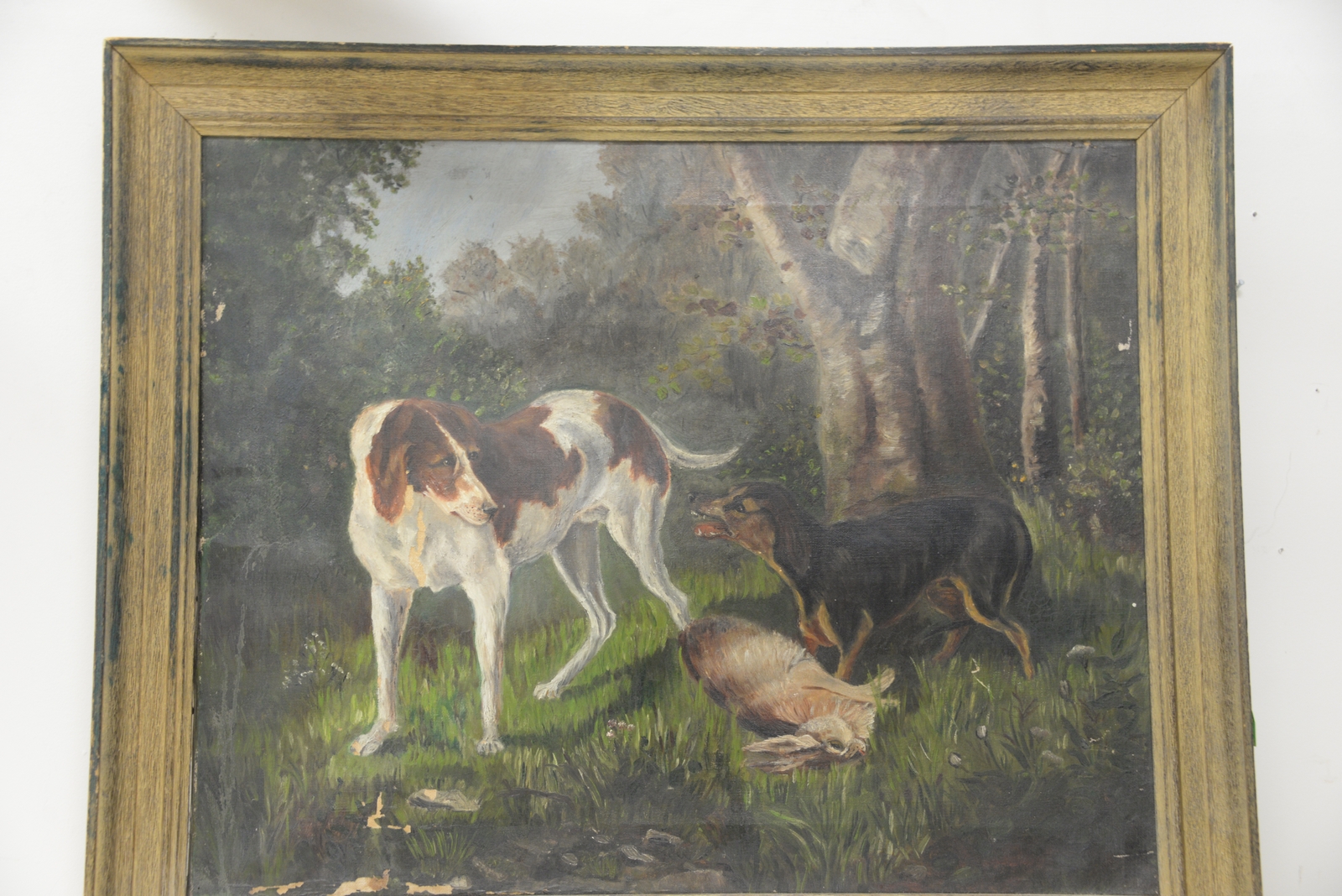 Group of four framed dog pieces to include pastel of a small dog unsigned, an oil on canvas of two dogs with a rabbit, a print Irish Setter, and an Edmund Henry Osthaus hunting dog print. sight sizes 7 x 8 1/2 to 16 x 12