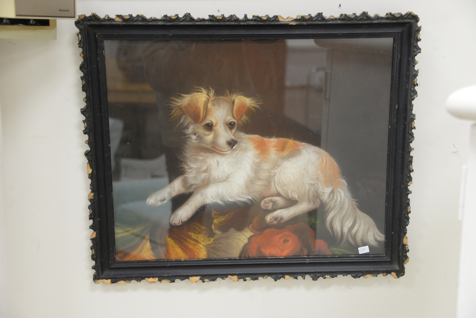 Lot 50: Group of four framed dog pieces to include pastel of a small dog unsigned, an oil on canvas of two dogs with a rabbit, a print Iris…