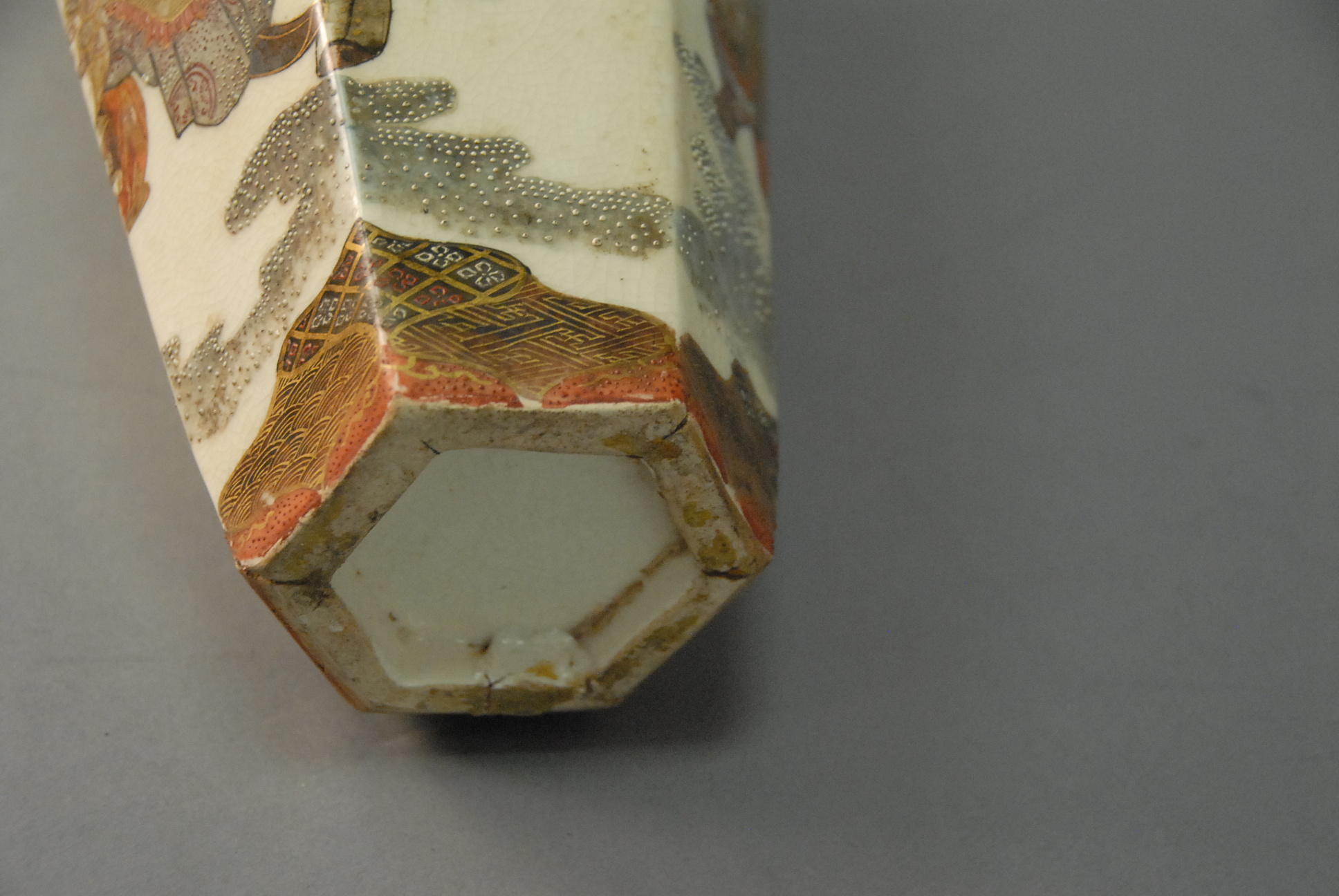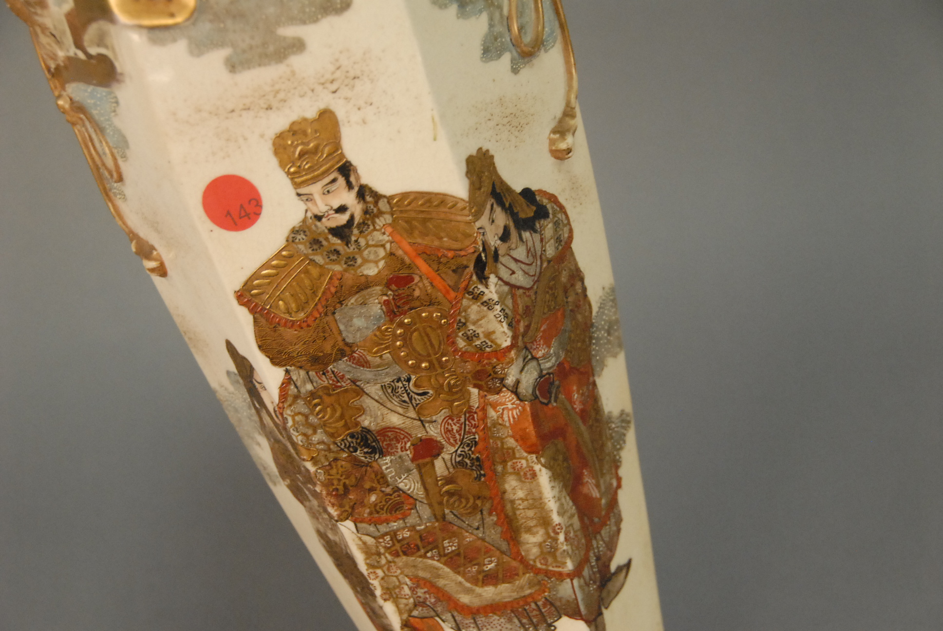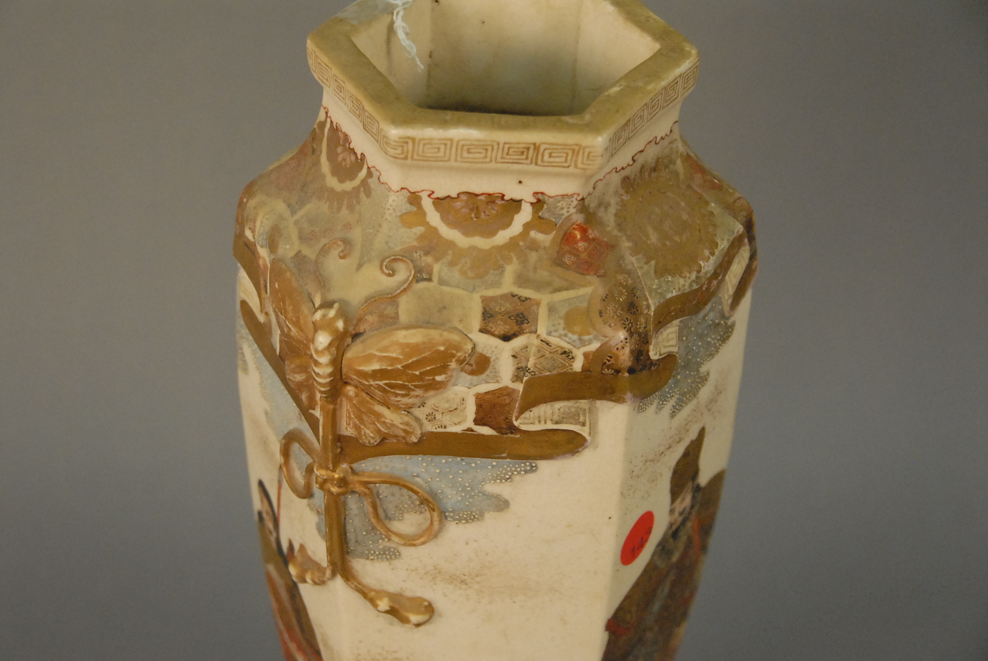 Lot 50: Large hexagonal baluster Kyoto Satsuma vase decorated with moth handles and drapery and central Shogun/Warlord and attendants, unmar…