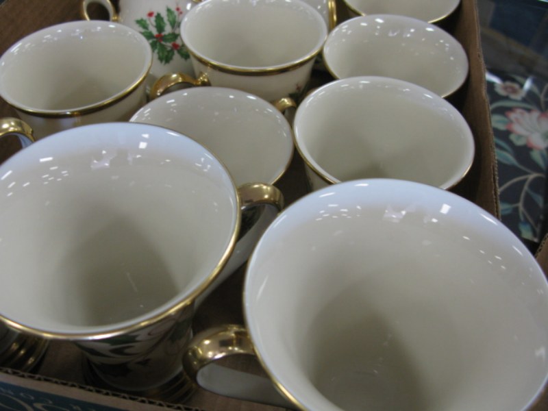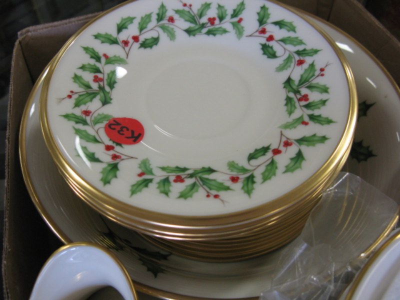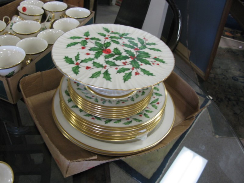 Large set of Lenox holiday china dinnerware, plates cups, saucers, cake plate, bowls etc.