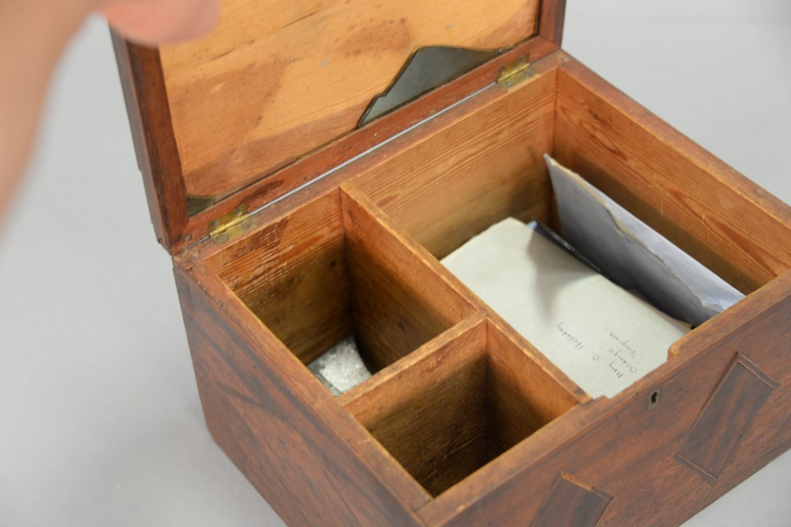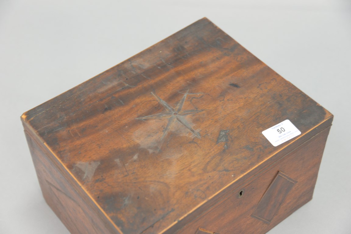 Lot 50: Mahogany inlaid box, top having star inlay and sides having diamond inlaid panels, ht. 7 in. wd. 9 in. lg 11 1/2 in.