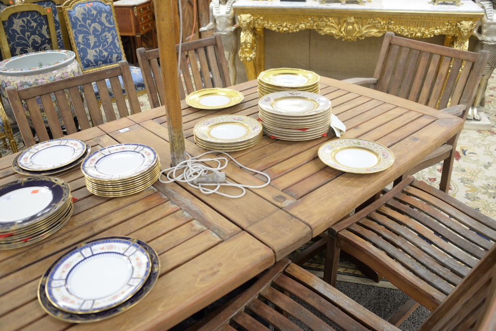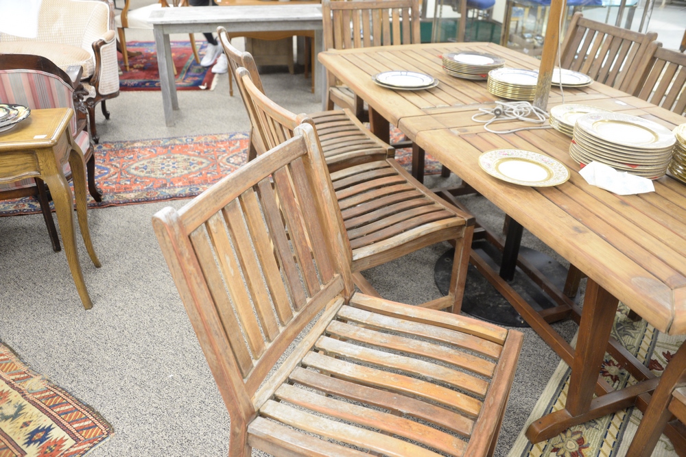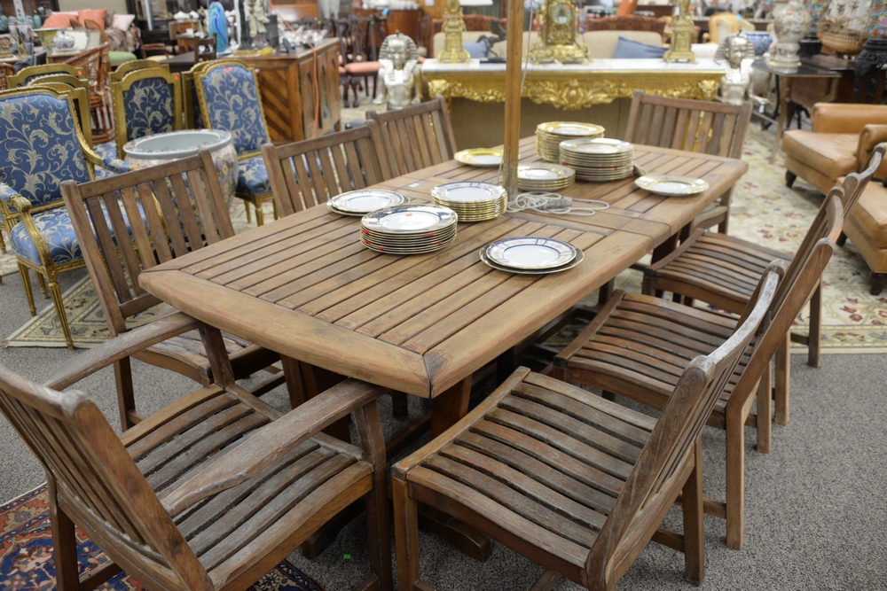 Nine Piece Brazilian Cherry Outdoor Patio Set, to include eight chairs, two arm chairs and six side chairs, along with a table having two 20″ built in leaves, Brazilian Cherry is stronger and more dense than teak, height 29 inches, top 41″ x 85″.