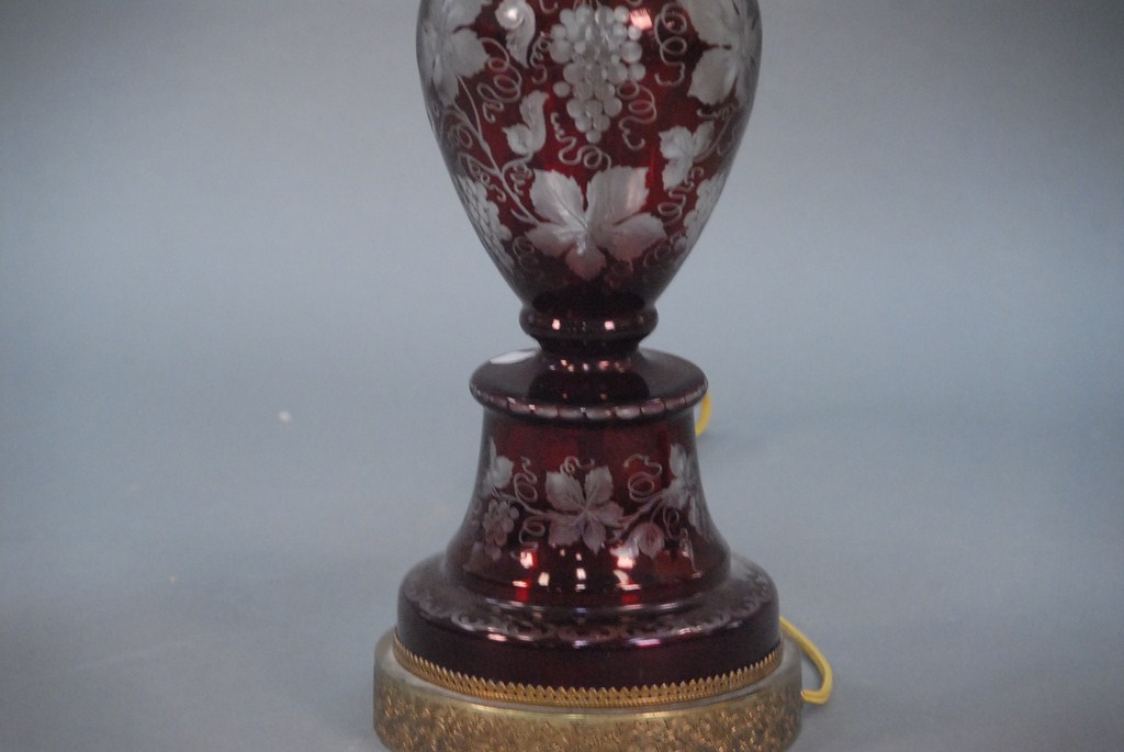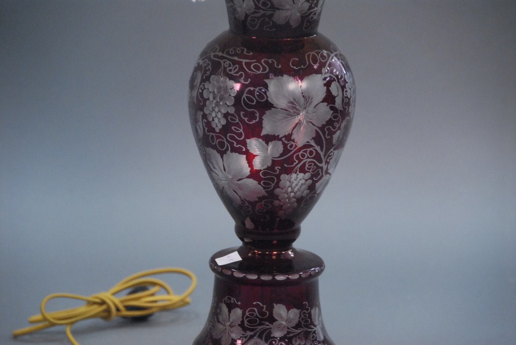 Pair of Bohemian glass cranberry table lamps with shades, total ht. 37.