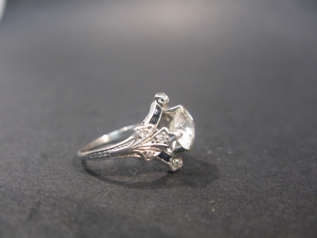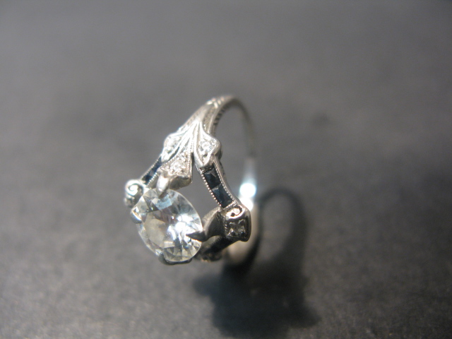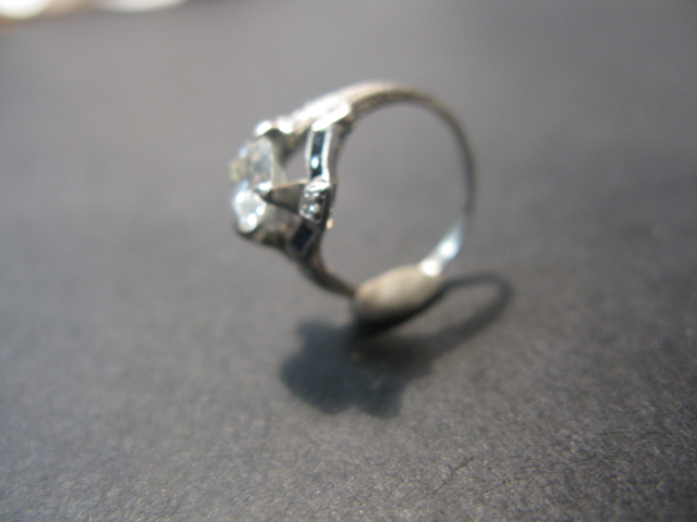 Platinum and diamond ring set with a center diamond approximately one carat surrounded by small blue stones, in antique setting, one small blue stone missing.