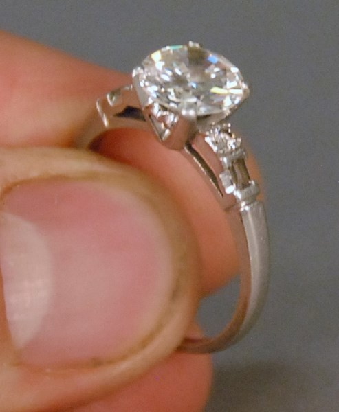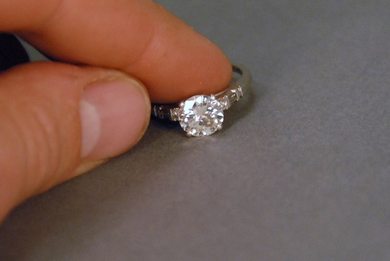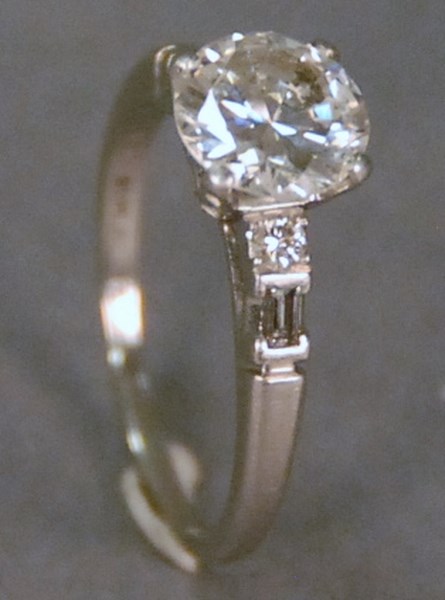 Lot 50: Platinum and diamond ring set with one 1 round brilliant cut diamond in center measuring 8.11 x 8.10 x 4.52mm with an approximate carat weight of 1.81 by formula, diamond has I color and VS2 clarity, ring has one round brilliant cut diamond and one