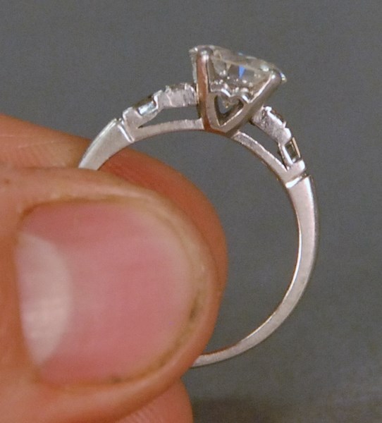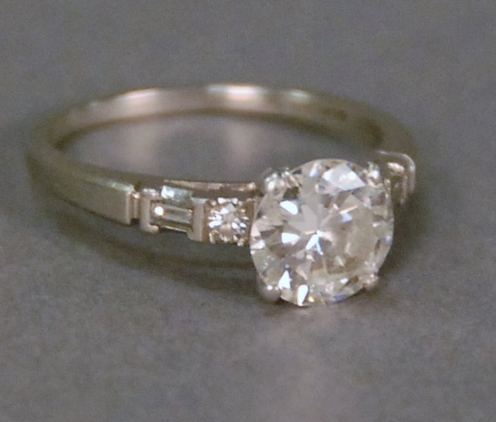 Platinum and diamond ring set with one 1 round brilliant cut diamond in center measuring 8.11 x 8.10 x 4.52mm with an approximate carat weight of 1.81 by formula, diamond has I color and VS2 clarity, ring has one round brilliant cut diamond and one baguette on each side, approximate total weight of each is .10 carats.