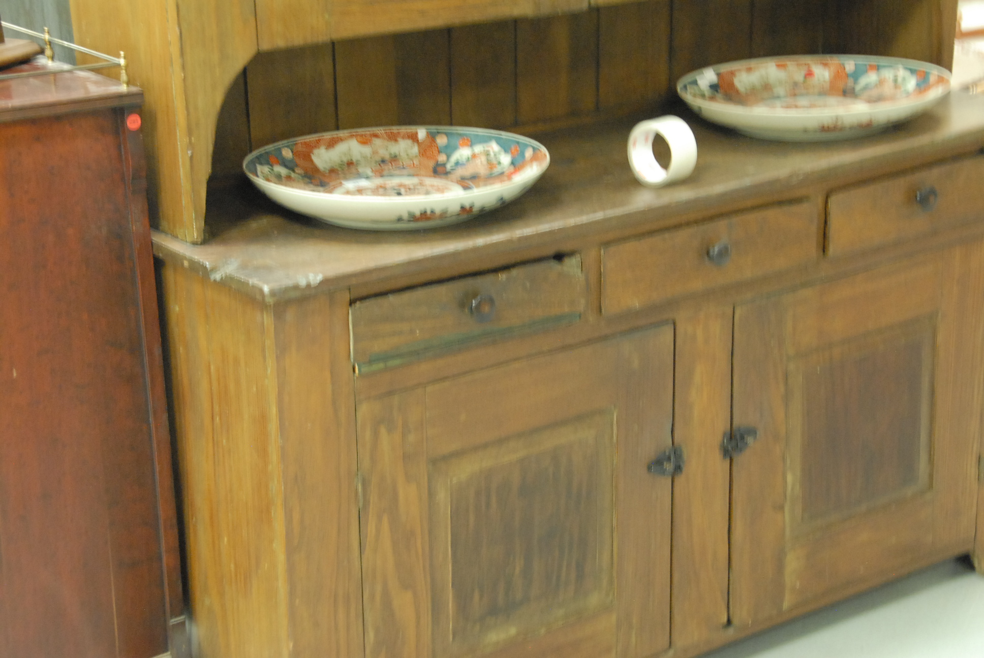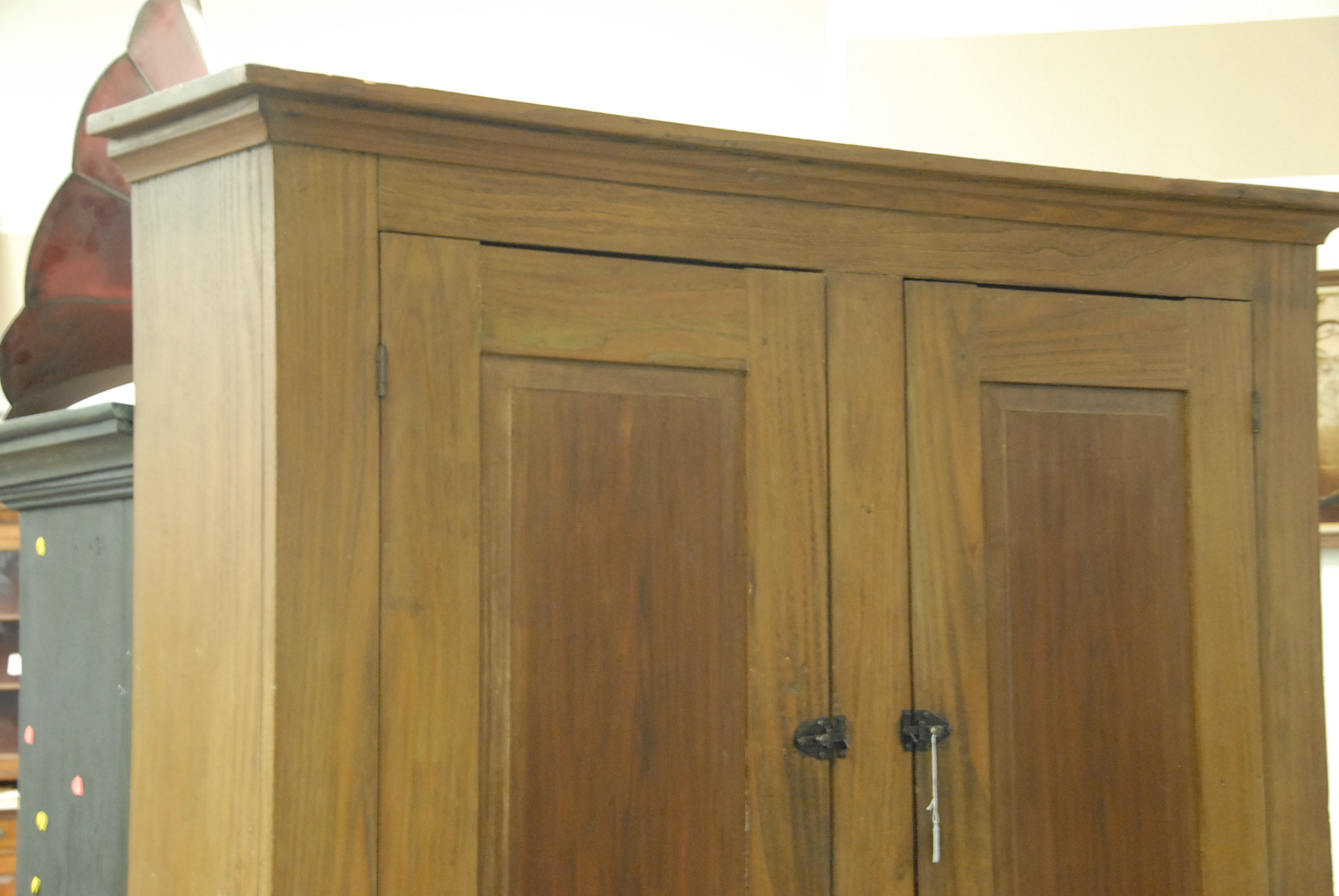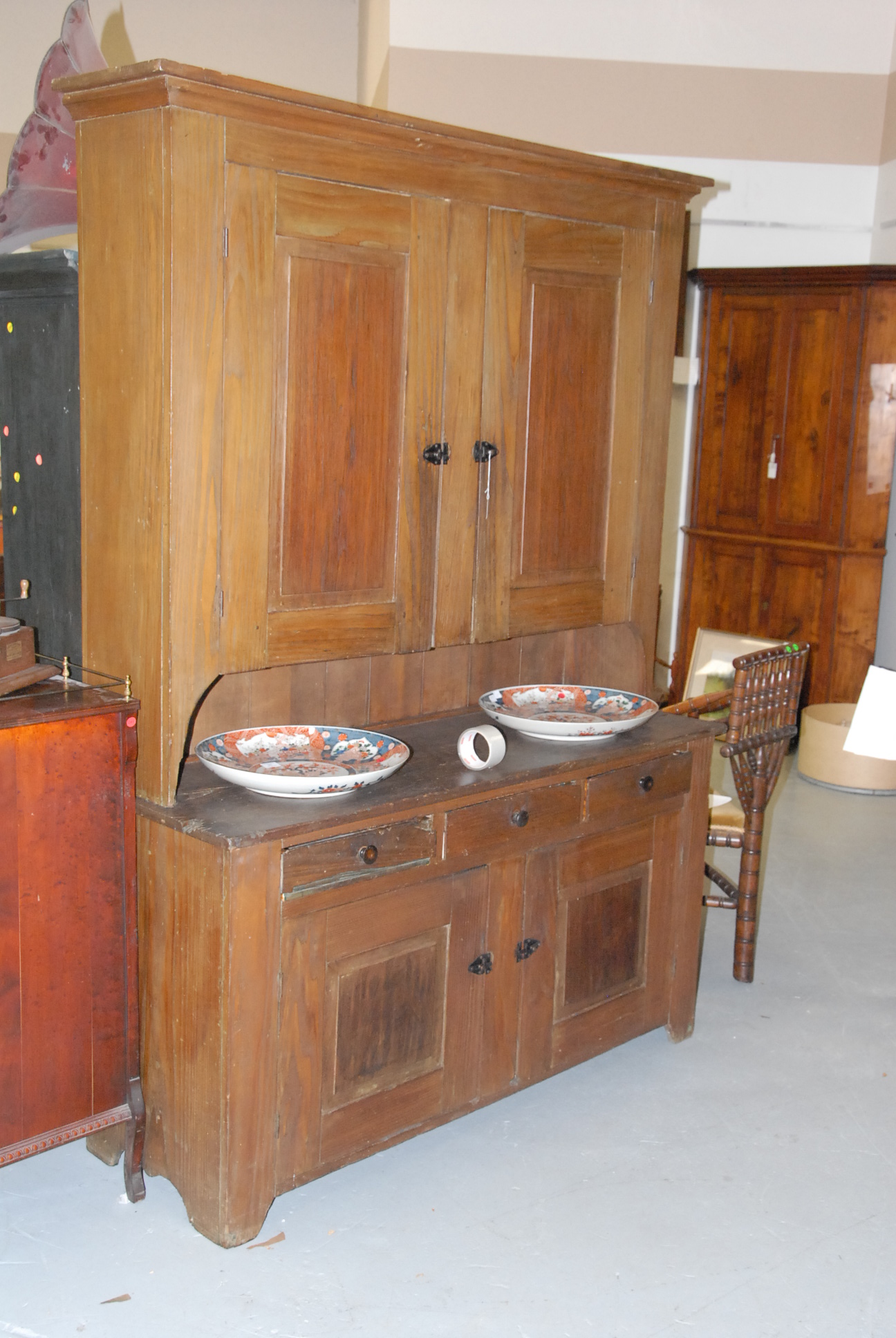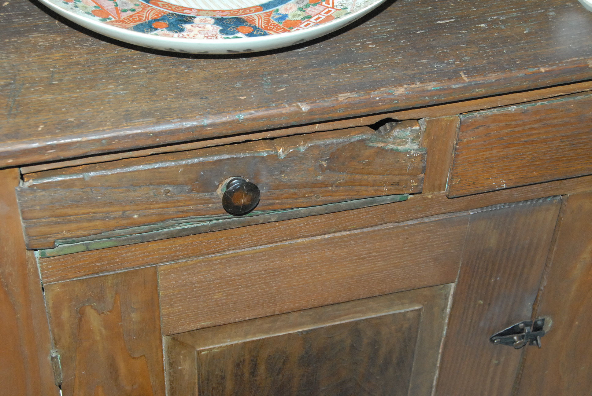 Primitive chestnut cupboard in two parts, two doors in upper section over three drawers and two doors.