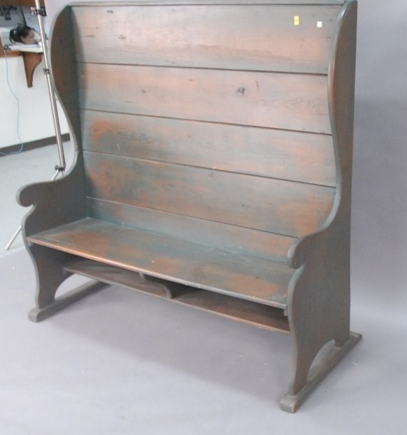 Lot 50: Primitive style settle bench attributed to Whitmore, Middletown, Connecticut, ht. 59, wd. 62.